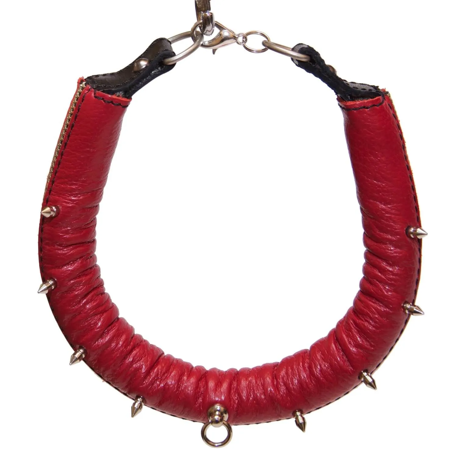 Поклонникам ролевых интимных игр придется по вкусу этот красный кожаный ошейник. Он декорирован металлическими шипами и молнией, благодаря которым он выглядит невероятно эффектно. У ошейника есть небольшое колечко, за которое его можно пристегнуть к поводку (в комплект не входит) за небольшой карабин, чтобы добавить играм еще большее разнообразие. Изделие прекрасно подойдет для БДСМ развлечений и позволит реализовать самые нескромные сексуальные фантазии.