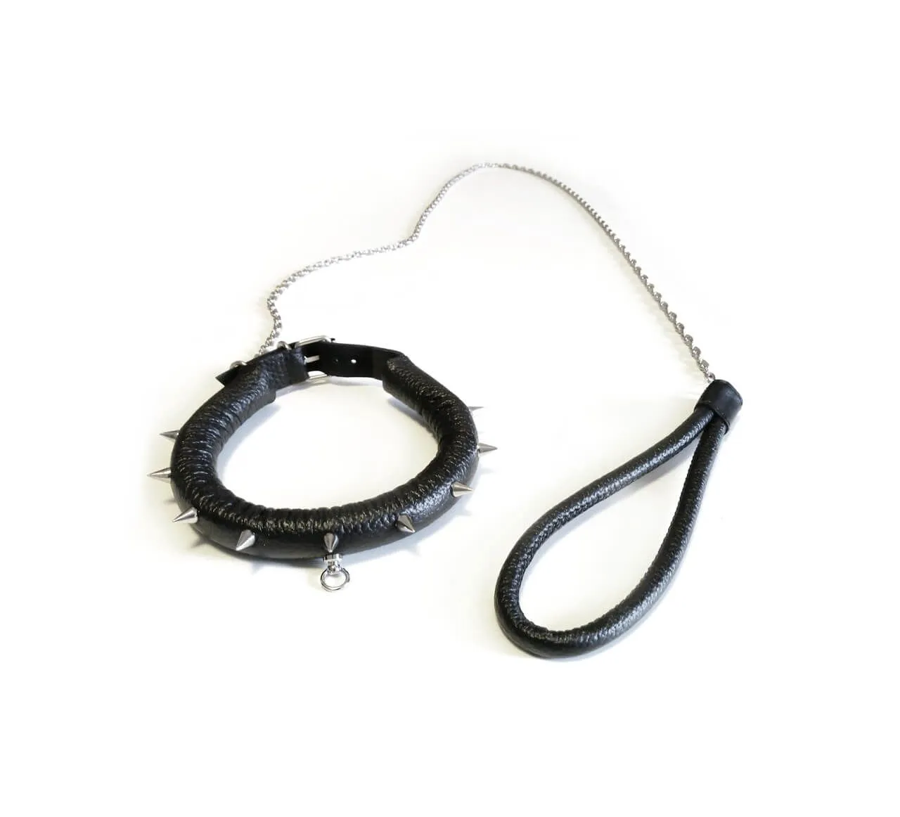 Поклонникам ролевых интимных игр с элементами БДСМ понравится черный кожаный ошейник, украшенный металлическими шипами. В комплекте с ним идет металлический поводок с удобной кожаной петелькой. Этот аксессуар позволит Вам подчинить себе своего партнера и в буквальном смысле слова держать его на коротком поводке. Также к нему можно присоединять и другие аксессуары при помощи карабинов благодаря наличию небольшого металлического колечка. Ошейник прекрасно подойдет для БДСМ развлечений и даст реализовать самые нескромные сексуальные фантазии.