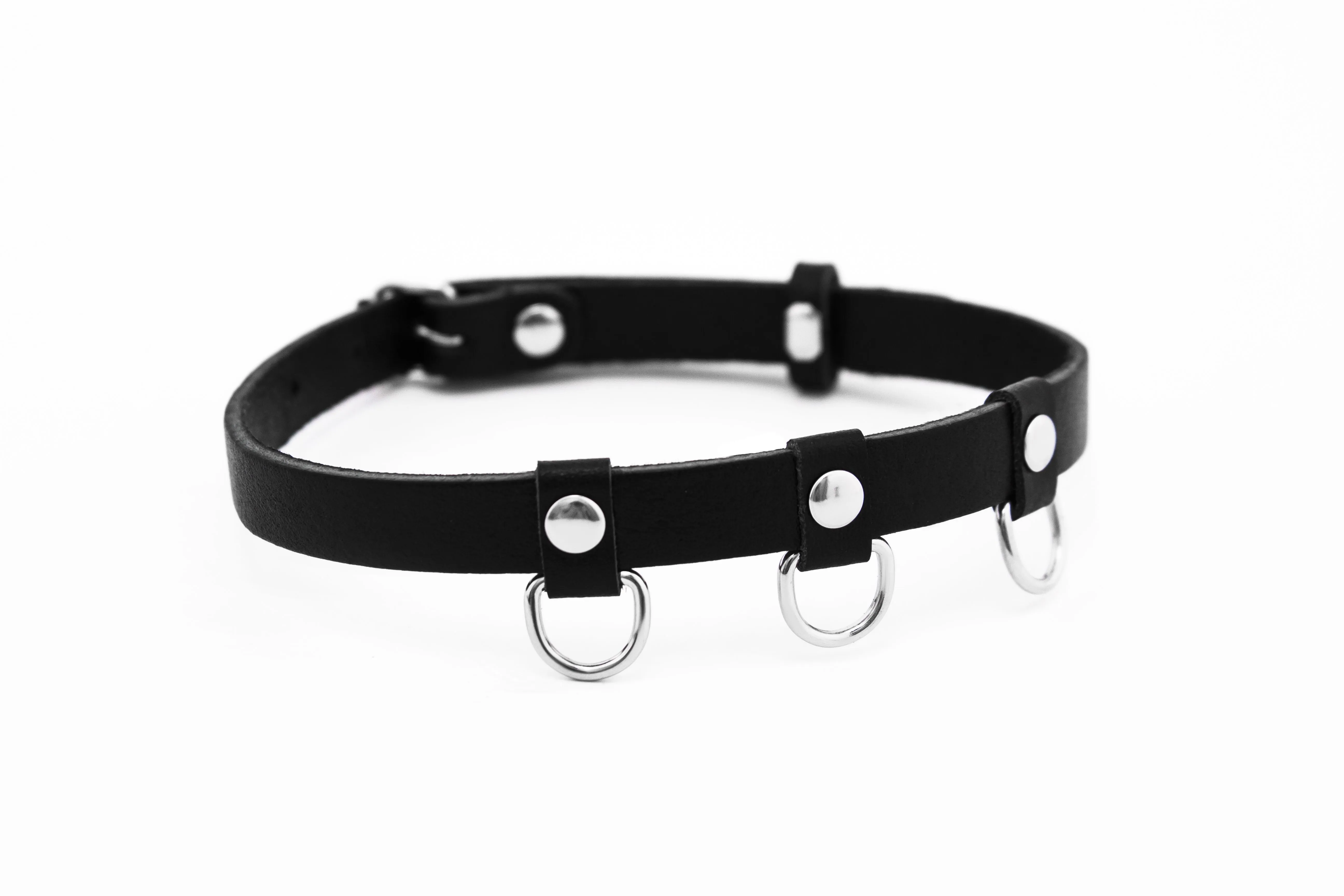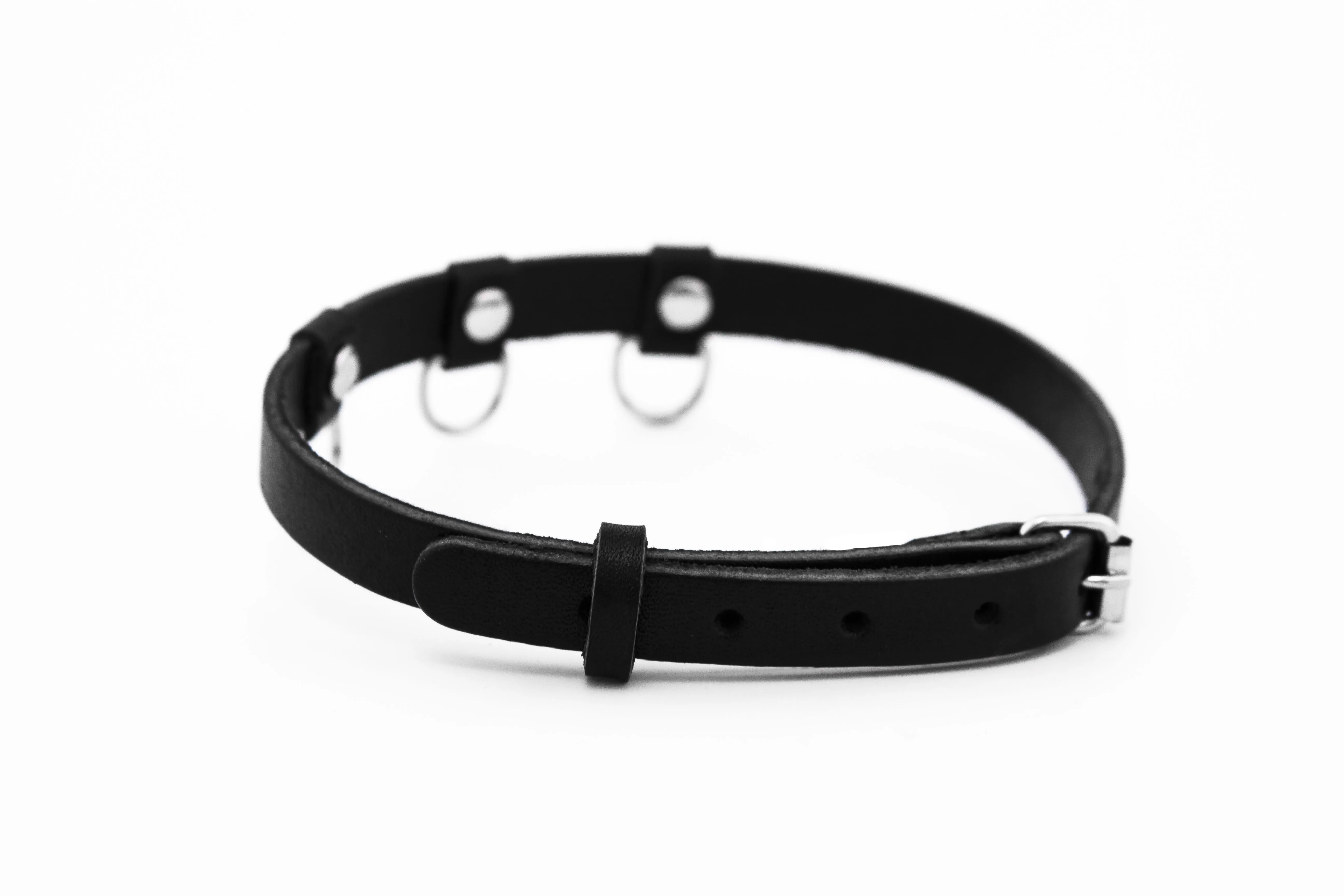 Чокер черного цвета из натуральной кожи будет прекрасным украшением, которое подчеркнет Ваш индивидуальный стиль и акцентирует внимание на прекрасной шейке. Также он сможет послужить Вам во время ролевых игр с элементами БДСМ, ведь благодаря трем небольшим металлическим кольцам к нему можно присоединить поводок или другие аксессуары. Это заметно разнообразит Ваши любовные игры и позволит испытать новые будоражащие ощущения.