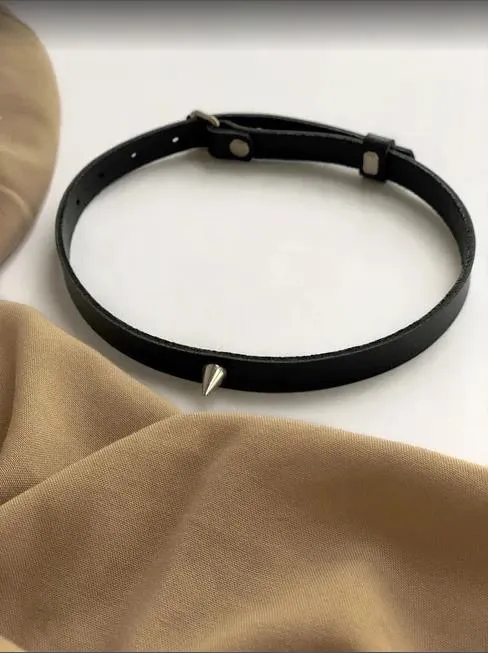 Чокер черного цвета с шипом из натуральной кожи будет прекрасным украшением, которое подчеркнет Ваш индивидуальный стиль и акцентирует внимание на прекрасной шейке. Также он сможет послужить Вам во время ролевых игр с элементами БДСМ, это заметно разнообразит Ваши любовные игры и позволит испытать новые будоражащие ощущения.