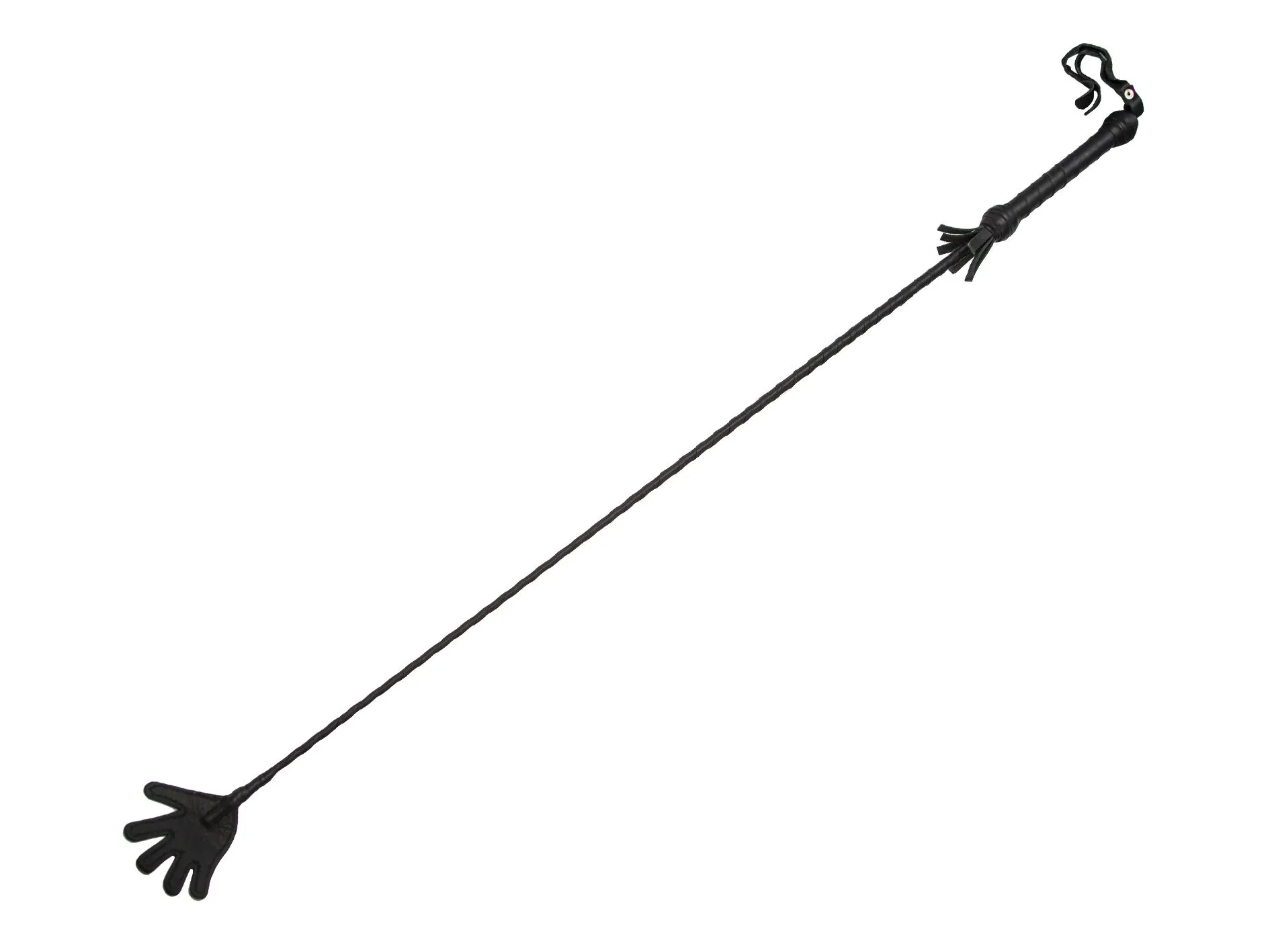 БДСМ стек длиной 850 мм состоит из гибкой основы, овитой натуральной кожей черного цвета, наконечника и удобной рукояти с петлей для надевания на руку (темляк).