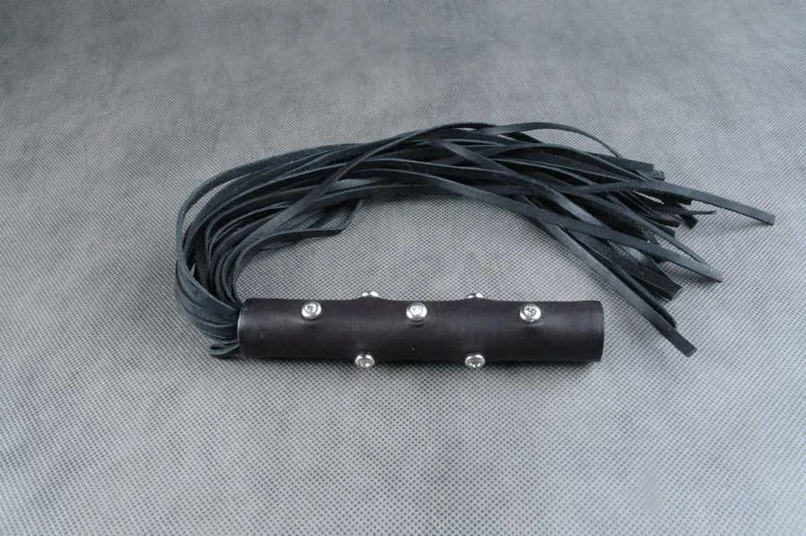 Плеть 25 полосная, средней жесткости, хвосты длиной 310 мм и шириной 5 мм, с прямым срезом на конце. Гладкая обернутая рукоять с 7-ю декоративными белыми стразами размещенными вертикально в 3 ряда (2+3+2) и петлей для подвеса.