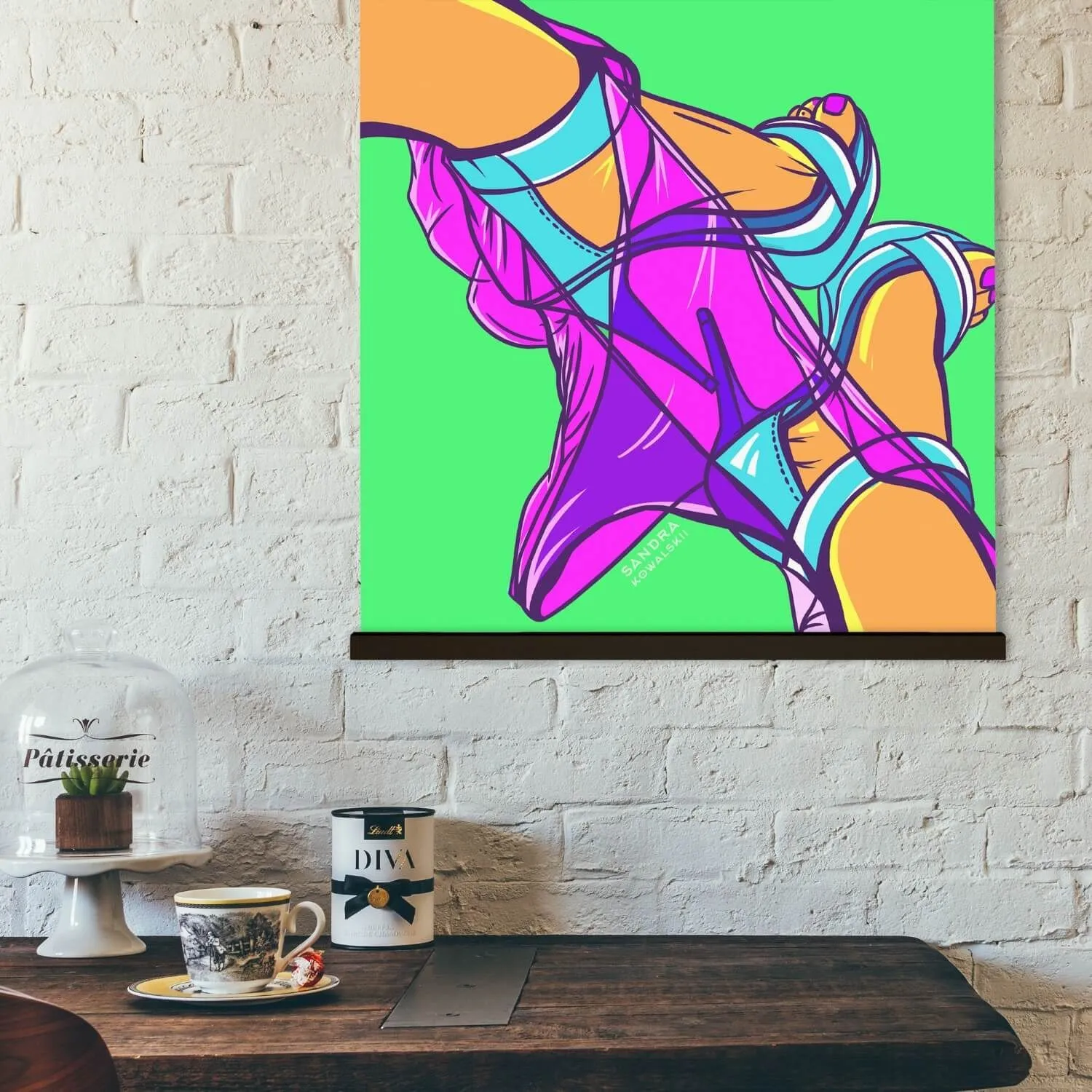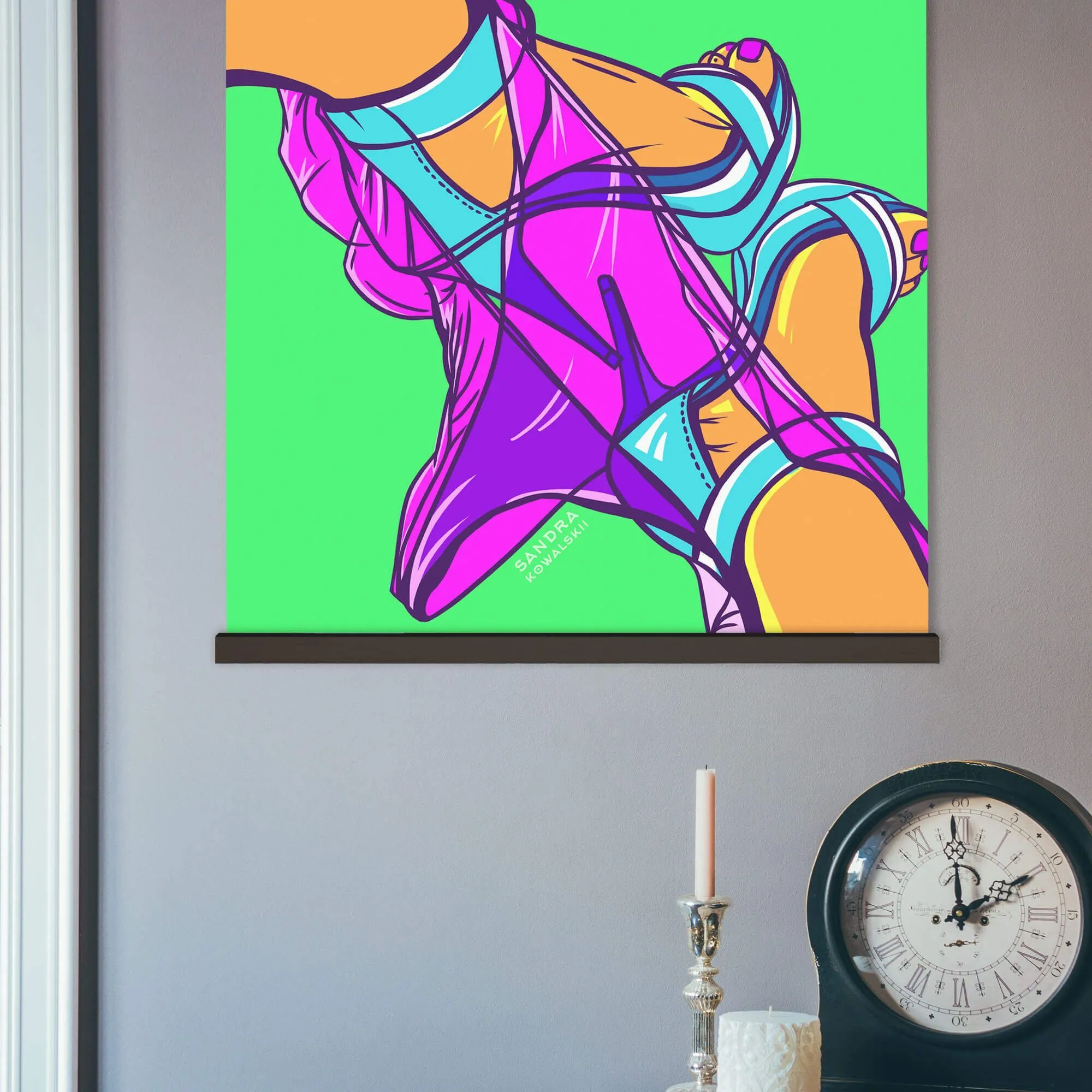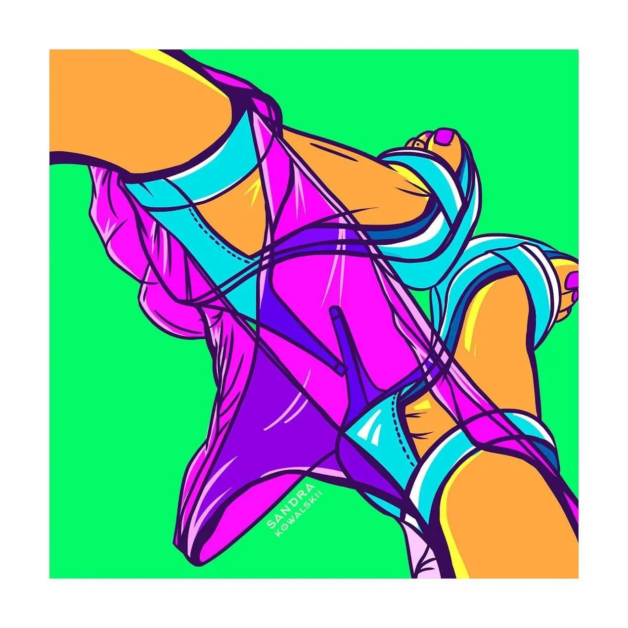 Постер «Feet» Сандры Ковальски, уже легендарного автора в мире эротического искусства, выполнен в стиле фанк и напечатан на плотной постерной бумаге (180-220 г/м2) с глубокой цветопередачаей. Он принадлежит к серии "Oh So Me Kinks" и очень ёмко описать его можно всего двумя словами - просто клубничка! Такой постер отлично подойдет для украшения спальни раскрепощенной пары или офиса с эпатажной атмосферой.