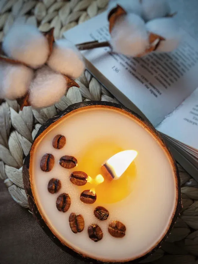 Наполните свой дом тёплым светом и живительным бодрящим запахом при помощи свечи в кокосовой скорлупе с ароматом "Кофейный крем". Кокосовый воск медленно плавится, заставляя кофе отдавать свой яркий аромат. Деревянный фитилёк, словно камин, издаёт при горении треск и создаёт уютную атмосферу тепла.
