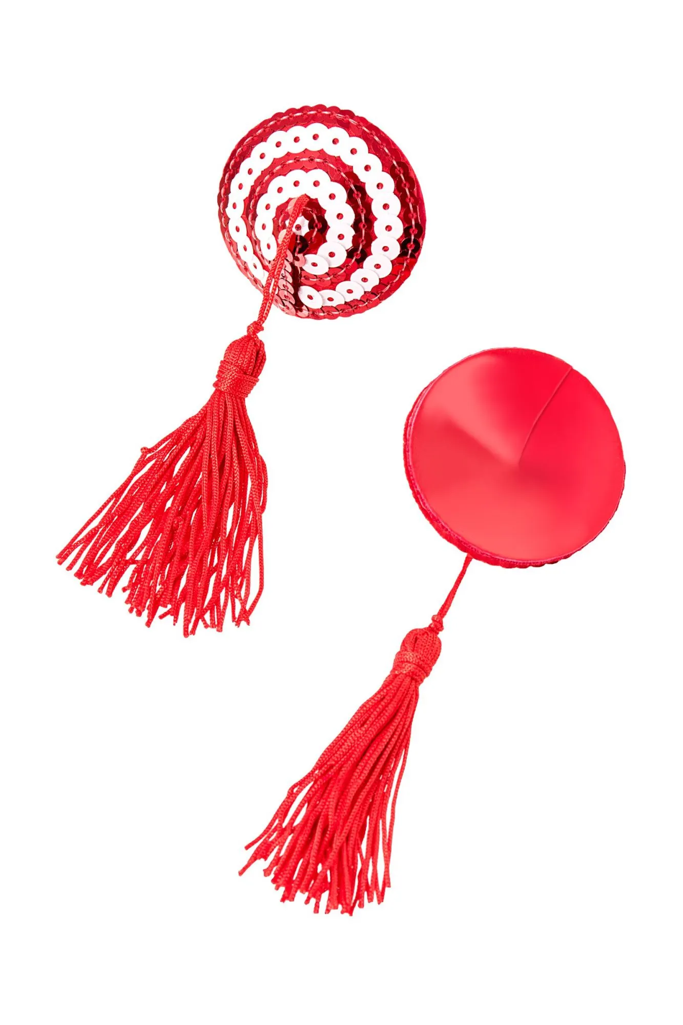 Наклейки на соски многоразовые. Конус выполнен из полиуретана, внутри — слой силиконового геля. Декор: пайетки, кисточки. Размер основания: 5 см. Длина кисти: 11 см. Наклеивать на чистую кожу без следов косметических средств. Снимать осторожно. После использования внутреннюю сторону промыть теплой водой. Хранить, изолировав клейкий слой пленкой или приклеив к стеклянной поверхности (зеркалу). Не использовать при гиперчувствительности к силикону, нарушениях пигментации или повреждениях кожи груди.