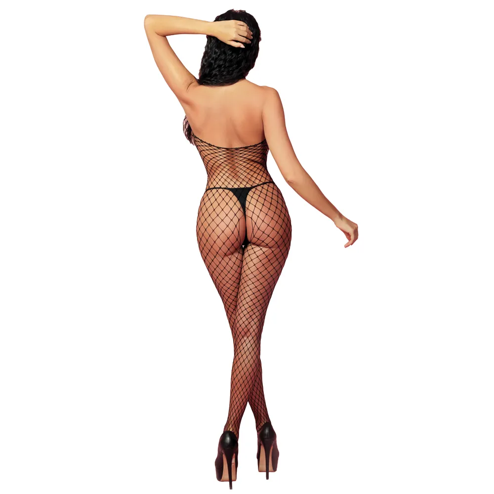 Боди-комбинезон в крупную сетку. Дизайн дополнен глубоким V-образным вырезом со шнуровкой спереди.