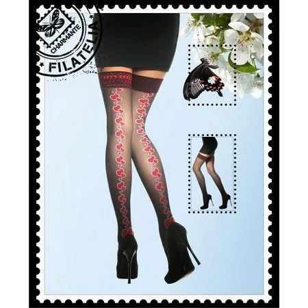 Женские чулки ANNAMENSIS от компании CHARMANTE подойдут девушкам с размером L/XL. Самоклеящиеся чулки хорошо держатся на ноге. Черные чулочки сзади и на резинке украшены рисунком из красных сердец разного размера. Такой дизайн делает ножки визуально длиннее и приковывает к ним множество восхищенных взглядов.