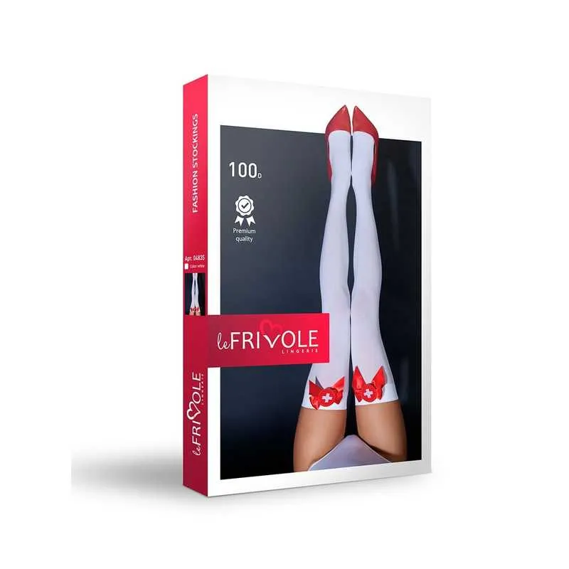 Белоснежные чулки пылкой медсестрички на любимой женщине? Конечно, да! Чулки с ярко-красными бантами и белым плюсиком – скорая секс-помощь уже в пути! Почувствуйте себя дерзкой соблазнительницей и вылечите любовный недуг вашего возлюбленного, а эти чулочки вам в этом помогут.