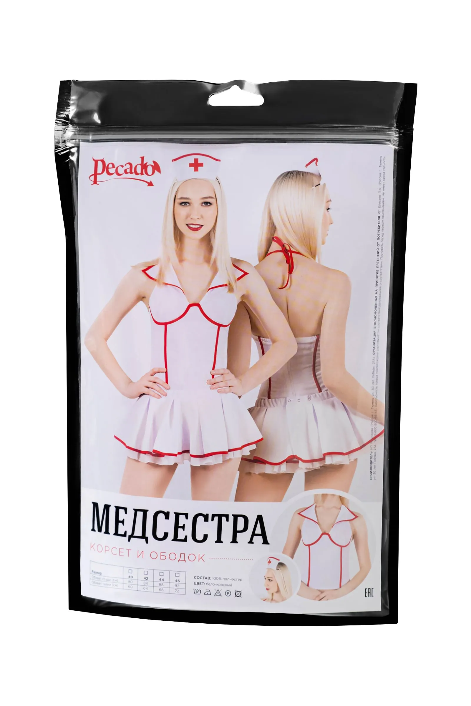 Нижняя и верхняя часть комплекта приобретаются отдельно. Именно так, Вы сможете подобрать оптимальный размер. Почувствуйте не передаваемые эмоции от ролевых игр, вместе с роковым костюмом горячей медсестры от Pecado. Эффектный корсет в бело-красных цветах соблазнительно облегает стан. Мягкая качественная ткань очень приятна к телу. Корсет легко надевается, хорошо фиксируется, и очень быстро снимается. Верхняя часть удобно регулируется на шее с помощью завязок. Вертикальные красные линии спереди визуально стройнят образ. Пикантный глубокий вырез подчёркивает грудь и возбуждает яркие фантазии. В костюм также входит ободок, который дополняет манящий образ. Помните: докторов в таких сексуальных костюмах не боится ни один плохой мальчишка! ● Состав комплекта – корсет, ободок. ● Материал – 100% полиэстер. ● Качественная фурнитура. ● Цвет – белый с красным. ● Сделано в России. ● Размерный ряд 40, 42, 44, 46 (Соответствует Российской размерной сетке).