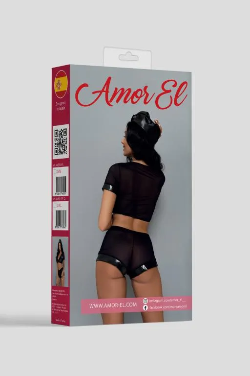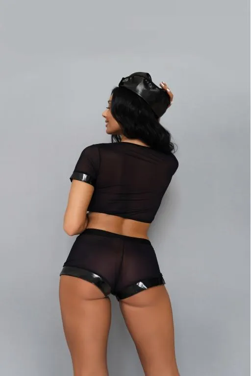 Комплект полицеского состоящий из сетчатой ткани выгодно подчеркивает фигуру и добавляет образу строгости. В комплект входит: топ со значком, мини-шортики на резинке, пилотка.