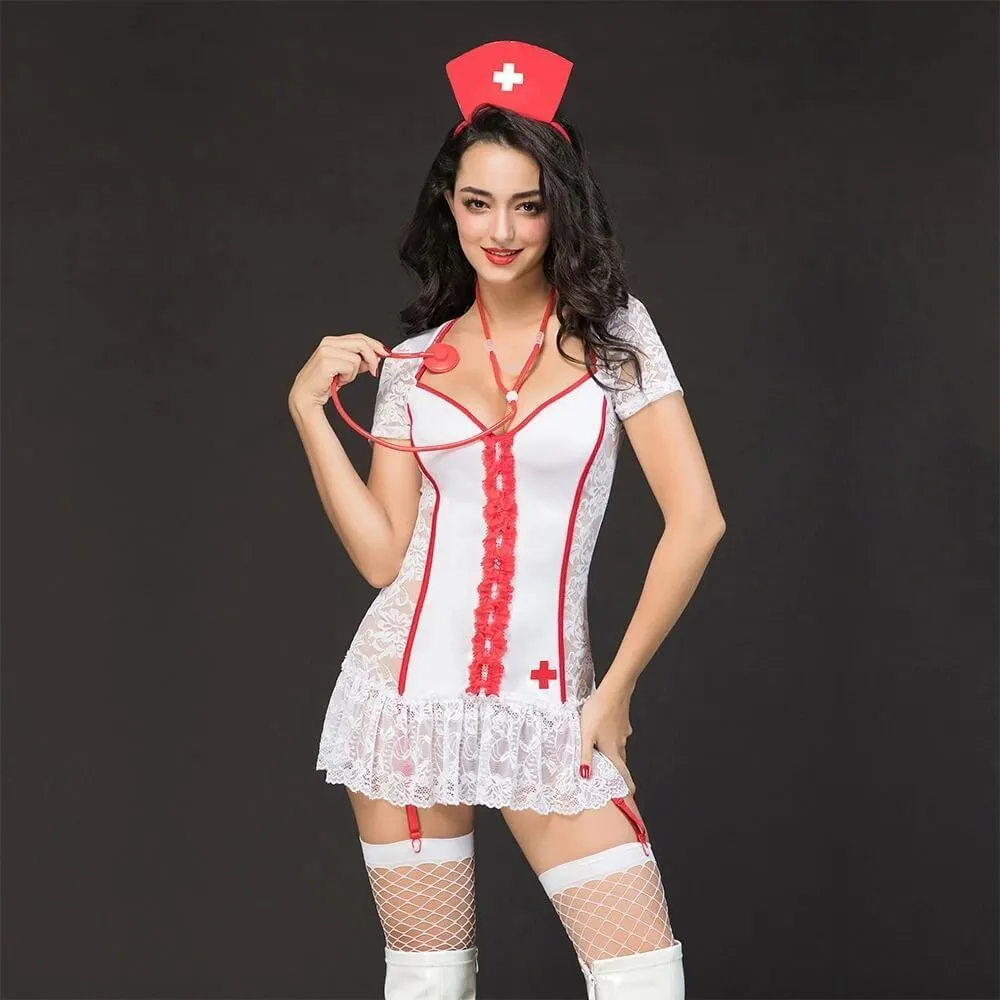 Костюм медсестры для ролевых игр состоит из платья, головного убора, трусиков, чулков и стетоскопа. Короткое платье украшено тонким белым кружевом с цветочным узором и характерной эмблемой красного креста. Чтобы Ваш образ стал еще более сексуальным, дополните костюм чулками на подвязках.