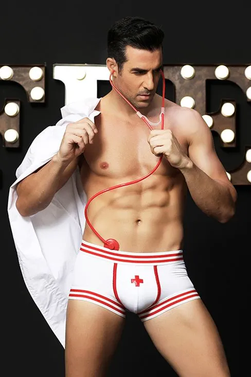 Плотный непрозрачный халат с отложным воротником, накладными карманами, короткими рукавами, контрастной отделкой и значком-бейджем, куда легко вписать имя. Слегка приталенный силуэт халата добавит стройности фигуре. Эластичные боксеры с контрастной отделкой, на широких резинках. Пластмассовый стетоскоп входит в комплект.