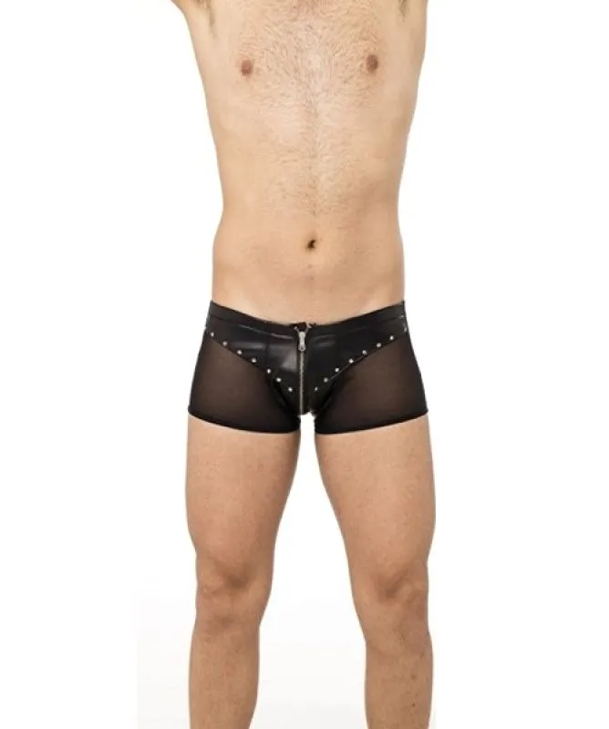 Мужские боксеры от бренда Lapin Rose сделаны из возбуждающего сочетания натуральной кожи черного цвета и прозрачной микросетки. Они декорированы металлическими клепками, придающими их виду большей эффектности. Спереди трусы застегиваются на молнию, которая не только будет очень удобна во время повседневного ношения, но и пригодится во время самых страстных моментов с партнершей. Сзади тонкая перемычка проходит вдоль ягодиц, прикрытых легчайшей тканью.
