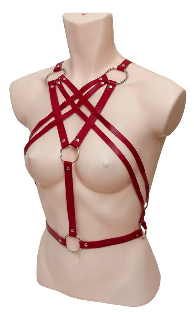 Портупея выполнена из кожи красного цвета и регулируется по размеру при помощи ремней. Спереди переплетение ремней, соединенных при помощи металлических колец, создает сложный и красивый узор. Сзади она хоть и выглядит довольно просто, однако при этом сможет подчеркнуть стройность Вашего стана.