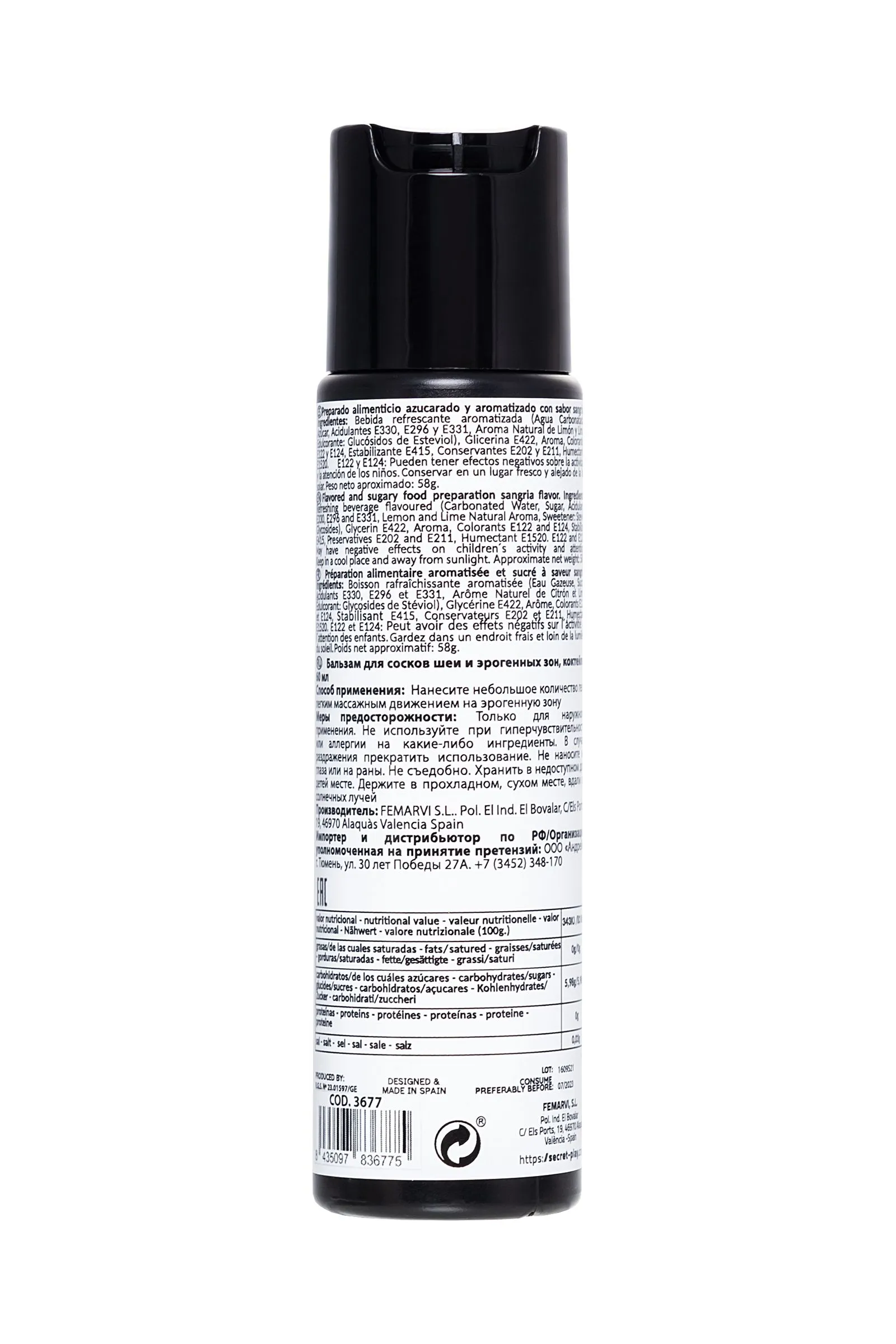 ИНТИМНЫЙ ГЕЛЬ СО ВКУСОМ ПИВА SANGRIA BALM 60 ML "DRUNK IN LOVE" Безалкогольный интимный гель на водной основе от Secret Play серии "DRUNK IN LOVE" Sangria Balm со вкусом сангрии идеально подходит не только для проникновения, но и для оральных ласк и стимулирования эрогенных зон. Необычный, слегка сладкий вкус и аромат дополнят сексуальную игру, с ним путешествовать по телу, облизывая и целуя эрогенные зоны, соски, шею, живот, станет намного интереснее. Кремообразная текстура этого геля обладает превосходными смазочными свойствами. Гель очарует своим восхитительным вкусом и ароматом солнечной сангрии – будет трудно устоять от соблазна совместить любовные игры с этим гелем. Емкость с системой «Disc-Top» Простое нанесение Содержание спирта 0% Объем: 60 мл (58 г) Вкус: сангрия Глицериновая основа Совместимость с презервативами и игрушками Состав: ароматизированный освежающий напиток (газированная вода, сахар, подкислители е330, е296 и е331, натуральный аромат лимона и лайма, подсластитель: стевиоловые гликозиды), глицерин е422, ароматизатор, красители е122 и е124, стабилизатор е415, консерванты е202 и е211, увлажняющий крем. e1520. е122 и е124. Способ применения: Нанесите массирующими движениями на желаемую область. Меры предосторожности: Не используйте при гиперчувствительности или аллергии на какие-либо ингредиенты. В случае раздражения прекратить использование. Не наносите на глаза или на раны. Хранить в недоступном для детей месте. Держите в прохладном, сухом месте, вдали от солнечных лучей.