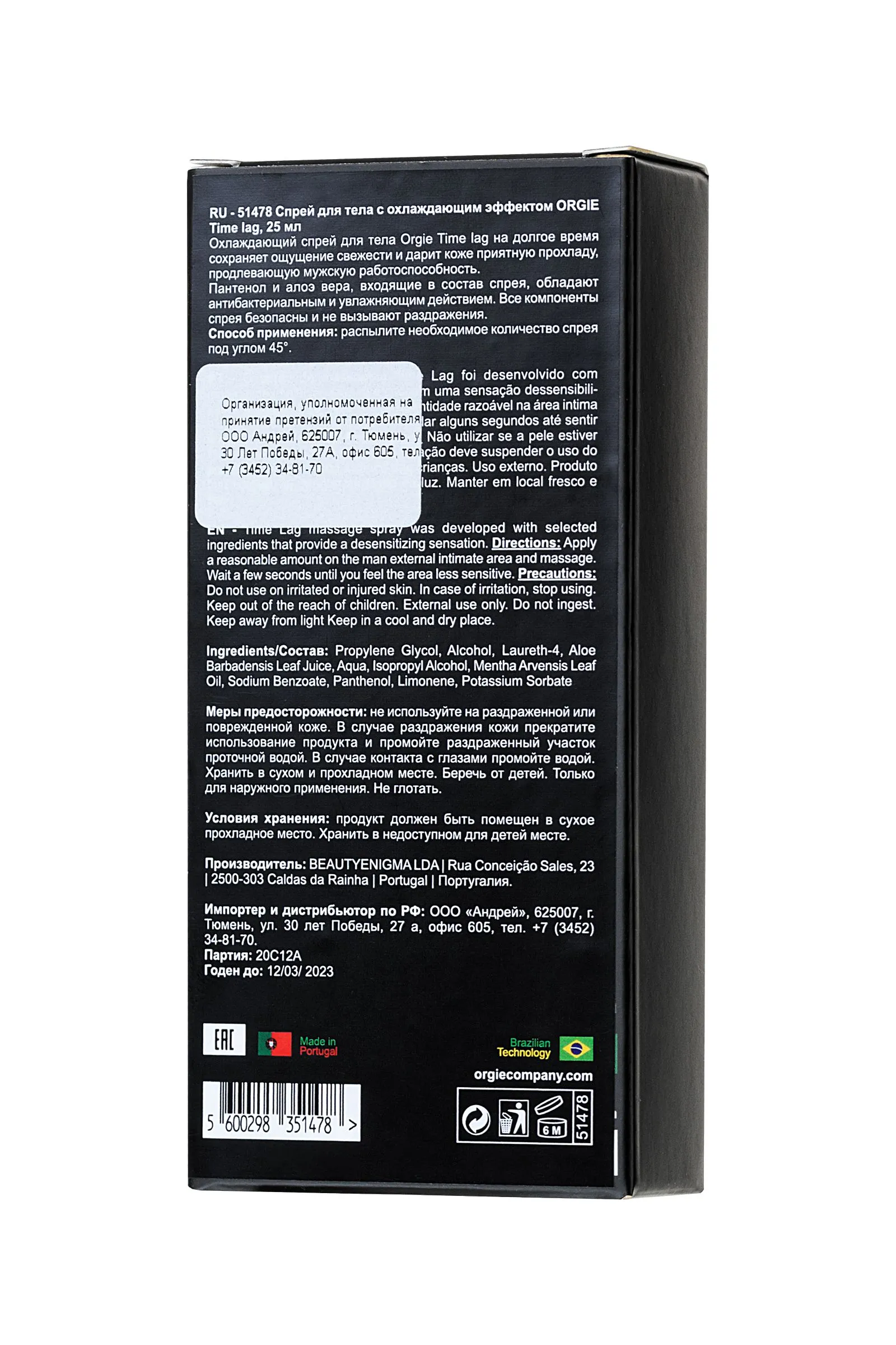 Охлаждающий спрей для тела Orgie Time lag на долгое время сохраняет ощущение свежести и дарит коже приятную прохладу, продлевающую мужскую работоспособность. Пантенол и алоэ вера, входящие в состав спрея, обладают антибактериальным и увлажняющим действием. Все компоненты спрея безопасны и не вызывают раздражения. Способ применения: распылите необходимое количество спрея под углом 45°.