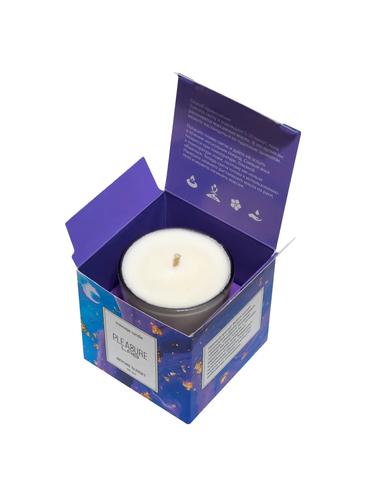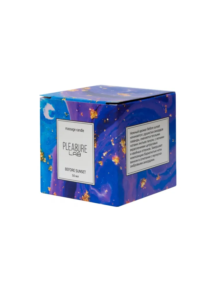 Массажная свеча Pleasure Lab - прекрасный проводник от легких заигрываний до страстного секса. Cвеча дарит ароматерапевтический эффект, позволяет расслабиться и создать интимную атмосферу. Свеча Before sunset обладает бархатисто-нежным ароматом с теплыми нотами пачули. Состав: натуральный соевый воск, натуральные масла: ши (карите), миндальное, кунжутное, виноградных косточек, ароматическая композиция и хлопковый фитиль. Способ применения: зажгите свечу и подождите 5-10 минут, пока расплавятся массажные масла. В это время вы можете наслаждаться её чудесным ароматом. Погасите пламя свечи и дайте ей остыть в течение нескольких секунд. Соевый воск плавится при температуре, близкой к температуре кожи, поэтому им нельзя обжечься. Теперь свеча готова к использованию. Нанесите немного растаявшего масла на руки, тело и можете начинать массаж. Время горения свечи - 5,5 часов. Условия хранения: хранить в темном месте при температуре от +7 до +20 градусов.