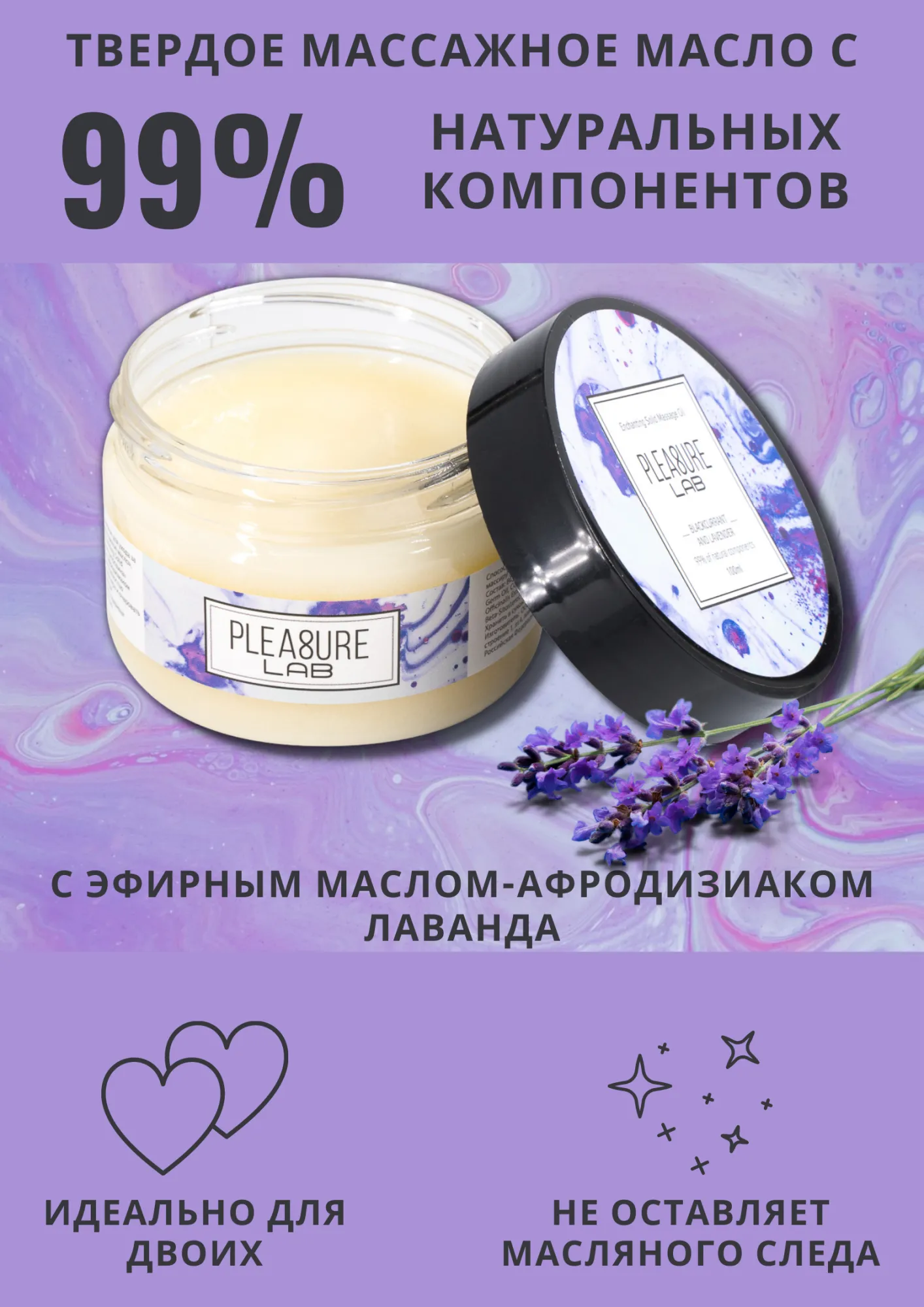 Pleasure Lab Enchanting с ароматом черной смородины и эфирным маслом-афродизиаком лаванда способно полностью расслабить тело партнера и очаровать изысканным ароматом со свежими нотками, одаривая небывалой нежностью. Способ применения: разотрите небольшое количество масла в ладонях и медленно начните продвигаться массирующими движениями от ступней к спине и плечам партнера. Подходит для самомассажа. Состав: масло ши (карите), миндальное масло, масло зародышей пшеницы, масло кокосовое, воск рисовых отрубей, парфюмерная композиция, эфирное масло лаванды, СК-СО2 экстракты (розмарин, лимон, облепиха, календула), натуральный антиоксидант (токоферол (смесь), бета-ситостерол, сквален), витамин Е. Срок годности- 2 года.