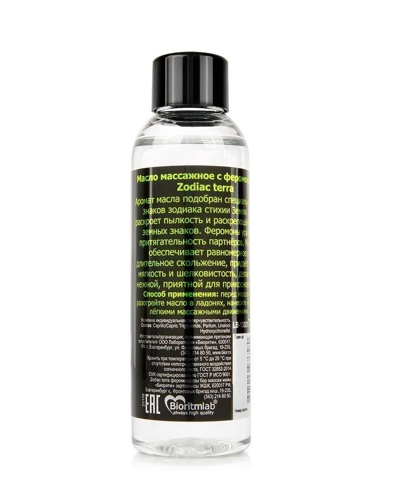 Массажное масло Zodiac Terra откроет мир чувственности и страсти, внесёт нотку пикантности и разнообразит интимную жизнь! Его аромат подобран в тандеме с астрологами специально для знаков зодиака стихии Земля - Козерог, Телец, Дева.