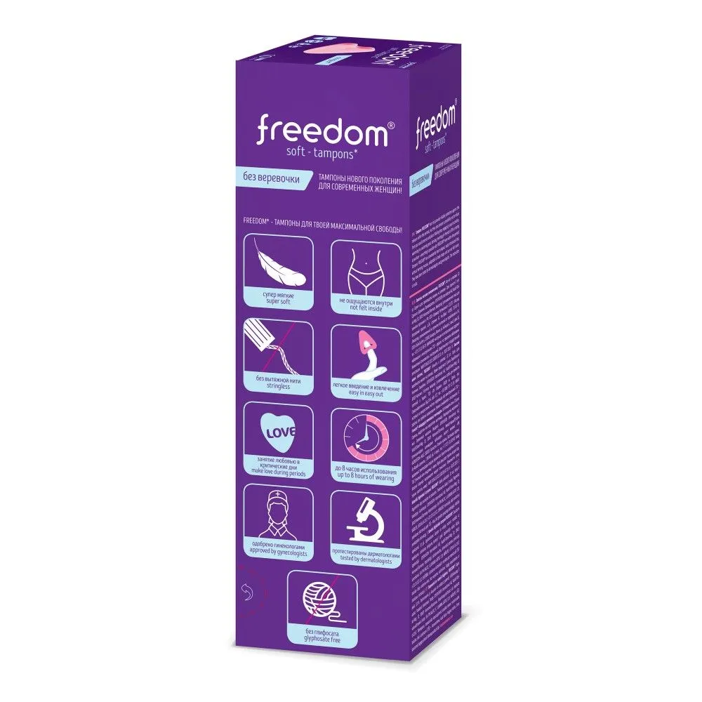 100% безопасный медицинский материал, разработанный для тампонов Фридом экспертным советом в Германии, не пересушивает слизистую и не травмирует ткани при введении и извлечении. Материал тампонов FREEDOM не увеличивается в размерах при впитывании. Вот прочему FREEDOM - это комфортные тампоны для секса и спорта, купания и активного образа жизни. Купание с тампоном, тренировки, фитнес и даже секс с тампоном – теперь ничто не помешает!