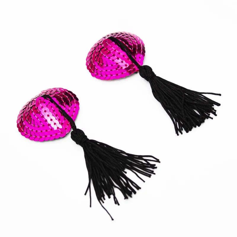 Чёрно-розовые пестисы на грудь в форме сердечек с кисточкой. Добавят изюминку в любовную игру, украсят соски, сделав грудь привлекательной и манящей. Внешняя сторона изделий отделана блестящими пайетками. На внутренней имеется специальный силиконовый слой, за счёт которого аксессуары держаться на сосках.