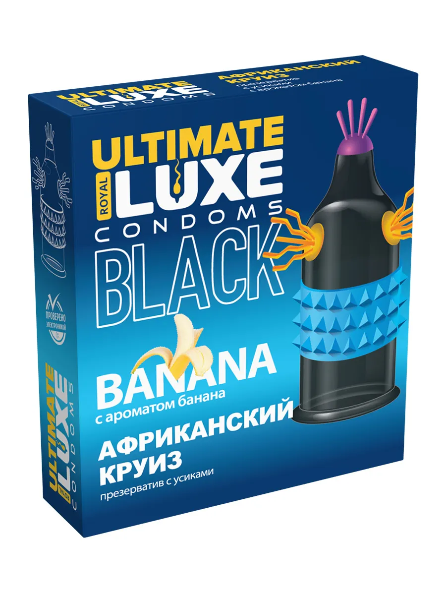 Пригласи ее в путешествие к первобытным оргазмам. Но не забудь взять с собой в приключение Африканский Круиз с ароматом банана. Брутальный латексный презерватив черного цвета с дополнительной стимуляцией Luxe BLACK ULTIMATE пробудит потаенные инстинкты и желания. Стимулирующие усики доставят наивысшее наслаждение, а дивный аромат банана добавит пикантности. Новые ощущения и разнообразие гарантированы. Качественный латекс Силиконовая смазка Ребристый рельеф Протестировано электроникой Длина 180 мм Ширина 52 мм Толщина стенок 0,06 мм