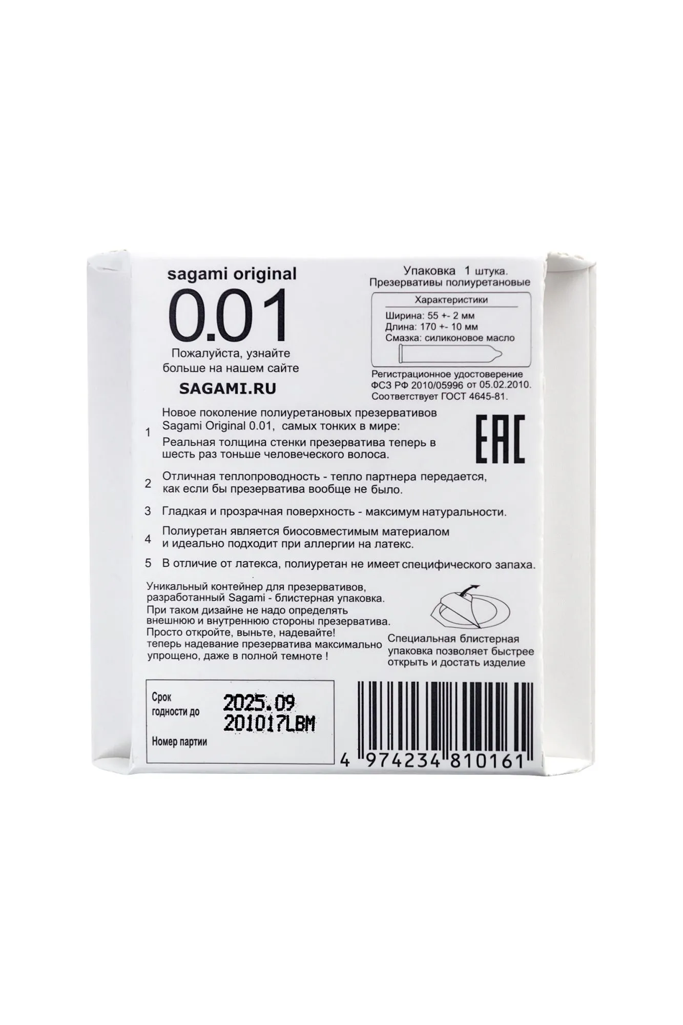 Революционные (не побоимся этого слова) презервативы Sagami Original 0.01 произвели такой фурор в Японии, что продаются в другие страны в крайне ограниченных количествах. Нет, производителям их не жалко, просто японцы раскупают их так быстро, что на экспорт практически ничего не остается. Чем же они так хороши? Это новое поколение супертонких полиуретановых презервативов. Толщина в 0,01 мм настолько мала, что позволяет партнерам чувствовать только друг друга, а не презерватив. Несмотря на ультратонкие стенки, Sagami Original 0.01 очень прочны и так же надежно защищают, как их более плотные собратья. Они мгновенно принимают температуру тела человека и придают стимуляции совершенную естественность. Не содержат протеинов и химических катализаторов, а значит, полностью гипоаллергенны и подходят даже людям с аллергией на латекс. Полиуретановые презервативы обладают нейтральным ароматом и не раздражают «резиновым» запахом, как латексные. Берите максимум удовольствия от секса вместе с презервативами Sagami Original 0.01.