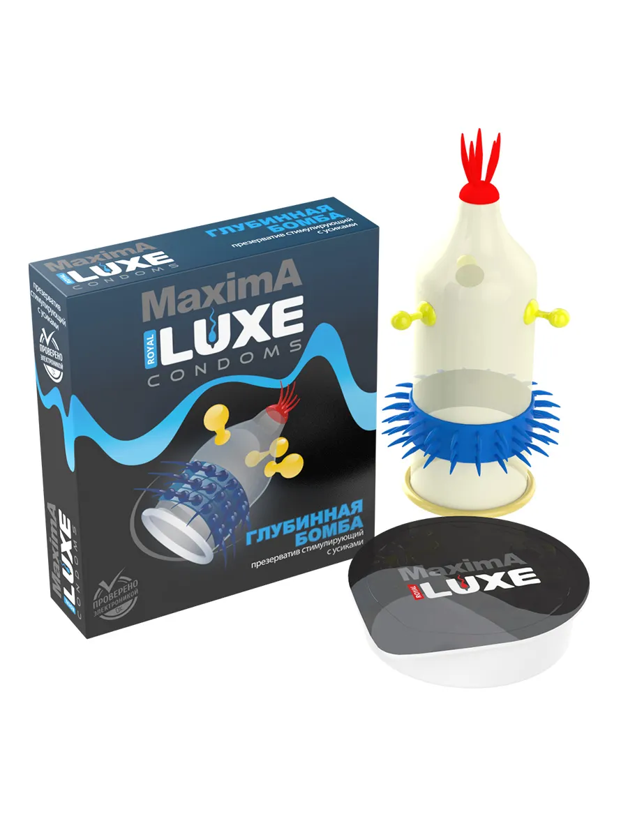 Luxe Maxima Глубинная бомба - латексный презерватив с пупырышками и мягкими усиками на конце. Благодаря приятной смазке для секса проникновение происходит легче и приятнее. Эта Глубинная бомба подобно мине замедленного действия таит в себе загадочный сюрприз. Плотный латекс контрацептива тугим кольцом обхватывает возбужденный фаллос и призывает начать интимную игру. Горячий полых страстного вожделения от нежного соприкосновения контрацептива с кожей стремительно захватывает сознание партнеров в пучину яркого экстаза.