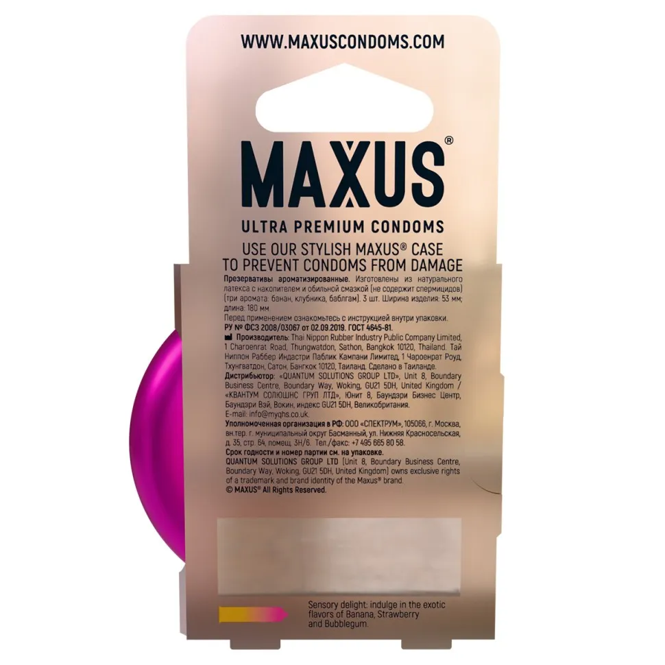 MAXUS Exotic Mix — для тех, кто любит разнообразие и никогда не отказывается от«сладенького». Три разных цвета и аромата (банан, клубника и бабл-гам).Презервативы гладкие цветные иароматизированные (банан - желтый,клубника - красный, бабл-гам - синий).Позволят побаловать себя экзотическимиароматами. Выполнены из высококачественного латекса, имеют классическую форму, в силиконовой смазке. В комплекте кейс для хранения. Номинальная ширина - 53 мм. Толщина стенки - 0,06 мм. В упаковке - 3 шт.