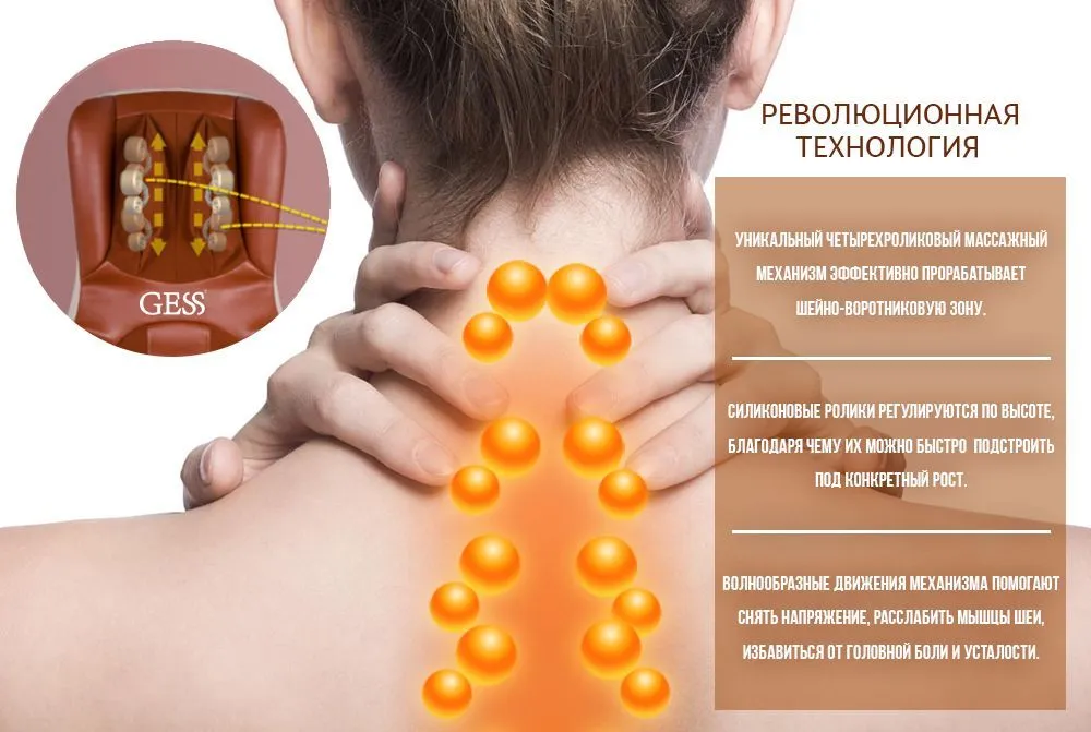 особенности массажной накидки Mustang. Кроме роликовых и вибрационных механизмов, накидка Gess Mustang оснащена 9-ю воздушными подушками, позволяющими проводить воздушно-компрессионный массаж поясницы и бедер, а так же имитировать приемы мануальной терапии и функцию «скручивания». Еще одной отличительной особенностью массажера Gess-17 является четырех роликовый механизм в шейном отделе, позволяющий проводить максимально эффективный 3D массаж шейно-воротниковой зоны.