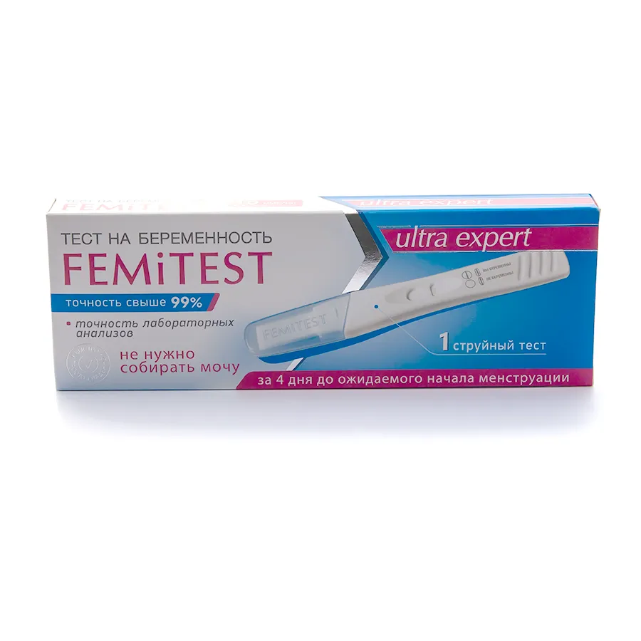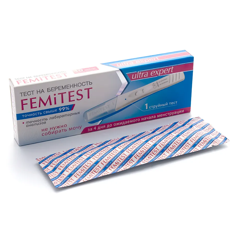 Струйный тест с ультравысокой чувствительностью нового поколения для определения беременности в домашних условиях ЗА 4 ДНЯ ДО предполагаемого дня начала менструации. Струйный тест – означает, что для проведения теста вам не нужно собирать мочу в ёмкость. Это обеспечивает гигиеничность процедуры. Действие теста основано на определении в моче женщины концентрации хорионического гонадотропина человека (ХГч) – это гормон, который начинает вырабатываться тканью хориона после имплантации эмбриона в стенку матки.
