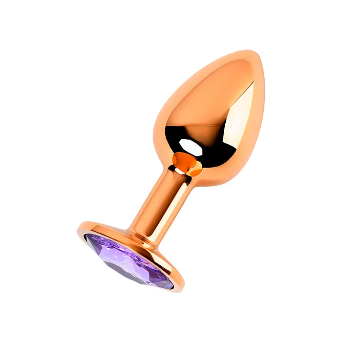 Металлическая блестящая золотистая анальная пробка от Pink Rabbit с переливающимся фиолетовым кристаллом в основании. Прелестная игрушка для разнообразия любовных игр и ласк.