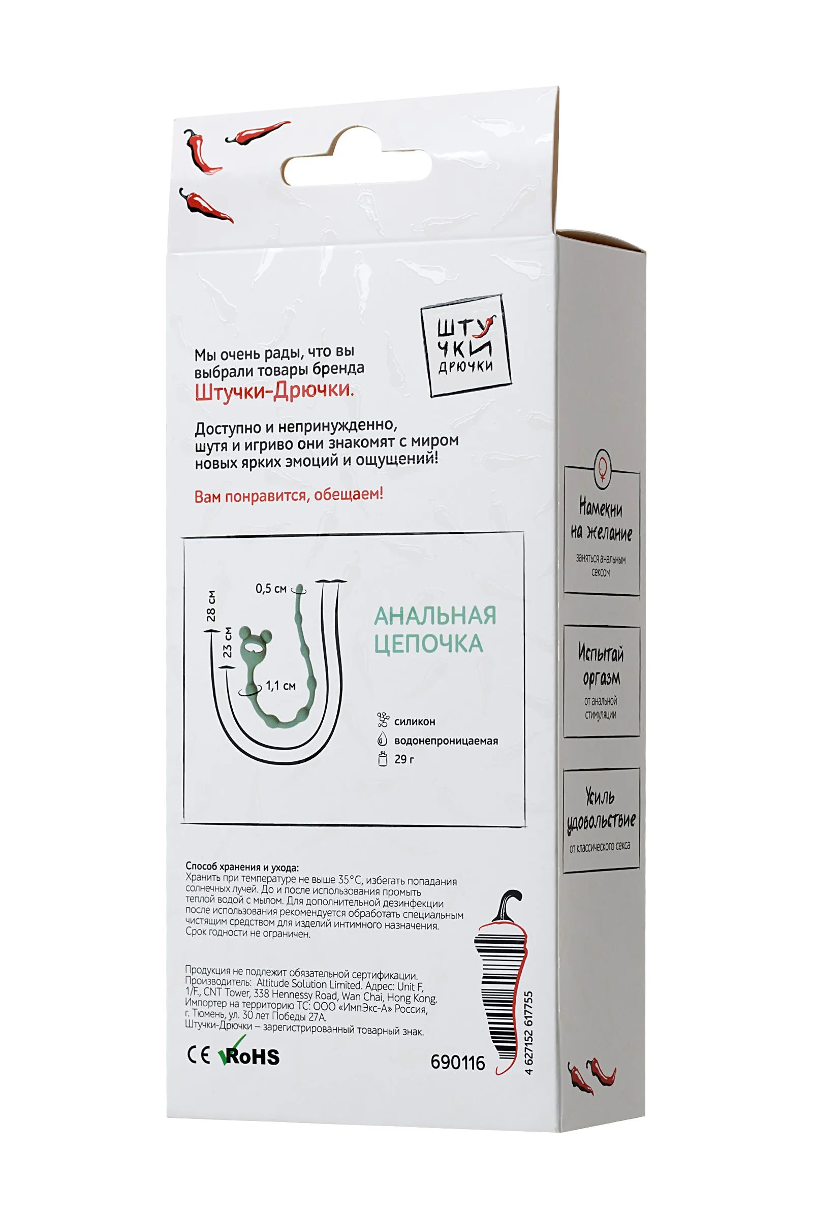 Штучка для другого входа Подготовка к анальному сексу Усиль удовольствие от классического секса Испытай оргазм от анальной стимуляции ⠀ Эта анальная цепочка создана для непередаваемых эмоций во время интимной близости. Длина цепочки за счет разделительных звеньев не напугает новичка и порадует опытного любителя пикантных ощущений. Ожерелье постепенно увеличивающихся в диаметре «горошин» приятно массирует и дарит совершенно особенное удовольствие. За счет элегантного хвостика-ушастика его комфортно вводить и извлекать без всяких затруднений. ⠀ Цепочка выполнена из гипоаллергенного силикона, прекрасно совместимого с лубрикантом на водной основе. С анальной цепочкой от бренда «Штучки-Дрючки» легко усилить удовольствие и вывести сексуальные отношения на новый уровень.