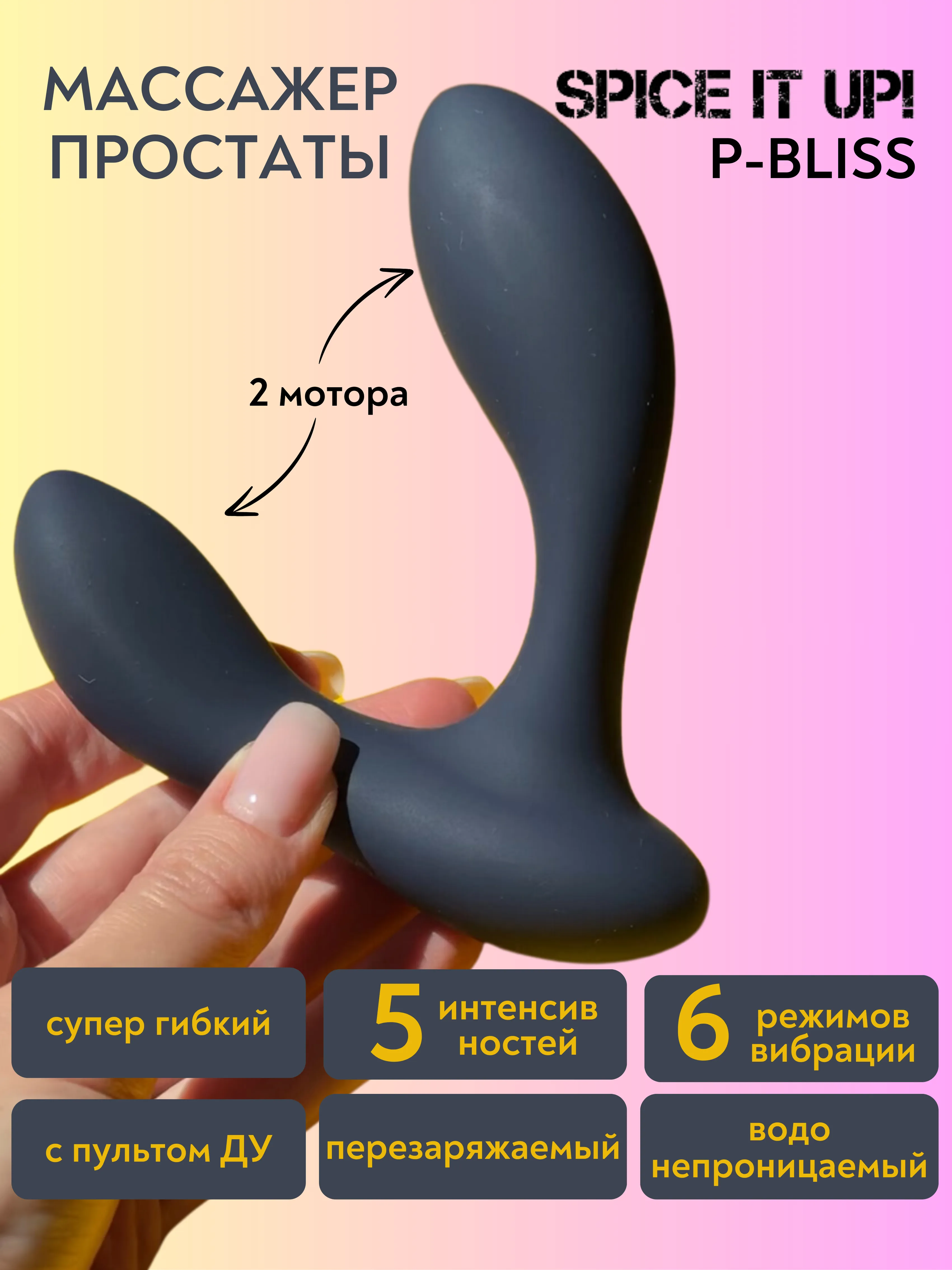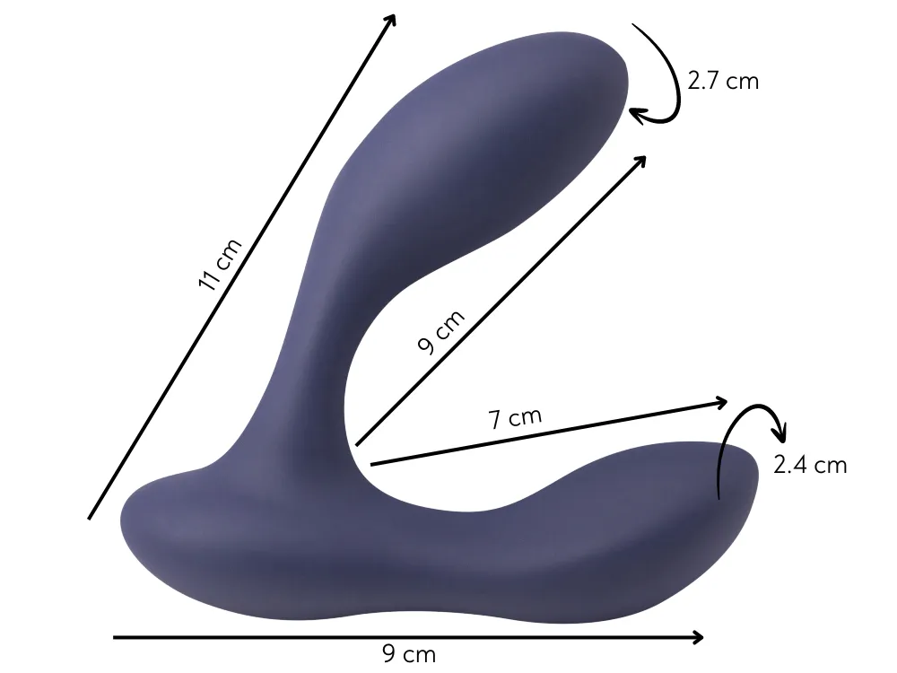 Spice it Up P-Bliss – это невероятно гибкий водонепроницаемый силиконовый массажер простаты с дистанционным управлением, который способен совместить приятное с полезным: повысить потенцию, сделать эякуляцию ярче и наполнить сексуальную жизнь новыми красками. Два вибромотора, оснащенные 6 режимами вибрации и 5 уровнями интенсивности, делают P-Bliss мощным и приятным в использовании устройством. Анатомически выверенная проникающая часть с изогнутым наконечником в сочетании с ее размерами гарантированно достигает чувствительной зоны каждого пользователя. Массажер заряжается от USB-зарядки, пульт работает на расстоянии до 7 метров. Время работы - 90 минут. Время зарядки - 120 минут. Верхняя часть: общая длина - 11 см, рабочая длина - 9 см, диаметр - 2,7 см. Нижняя часть: общая длина - 9 см, рабочая длина - 7 см, диаметр - 2,4 см.