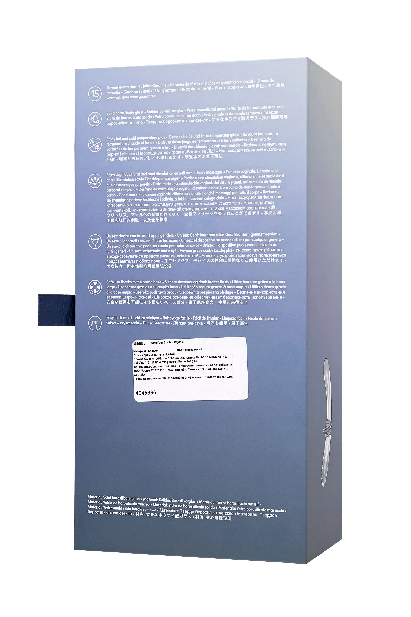 Исследуйте новые грани удовольствия с двойным анальным фаллоимитатором Double Crystal от Satisfyer. Этот произведение искусства из высококачественного боросиликатного стекла обеспечивает несравненные ощущения и множество возможностей для удовлетворения ваших желаний. Его преимущества – стеклянная элегантность, прочность и гипоаллергенность. Double Crystal разработан для удовлетворения людей любого пола. Одна сторона фаллоимитатора украшена рельефными ребрами, предлагая текстурную стимуляцию. Другая сторона абсолютно гладкая – для деликатной анальной эйфории. В середине фаллоимитатора размещен надежный ограничитель-стоппер, гарантирующий безопасность и комфорт во время использования. Боросиликатное стекло позволяет регулировать температуру фаллоимитатора. Охладите его или подогрейте для дополнительного удовольствия. Экспериментируйте с разными температурами, создавая волнующие ощущения и раскрывая новые сенсации. Прозрачное стекло позволяет вам наблюдать за каждым движением, придавая вашим интимным моментам особую магию. Double Crystal призван добавить в вашу интимную жизнь изысканность и роскошь. Позвольте себе наслаждаться высоким искусством удовольствия.