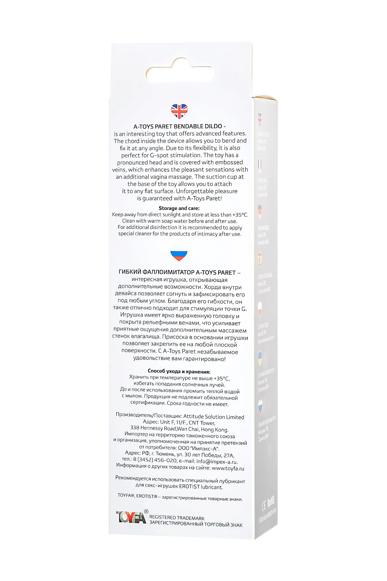 Гибкий фаллоимитатор A-Toys Paret – интересная игрушка, открывающая дополнительные возможности. Хорда внутри девайса позволяет согнуть и зафиксировать его под любым углом. Благодаря его гибкости, он также отлично подходит для стимуляции точки G. Игрушка имеет ярко выраженную головку и покрыта рельефными венами, что усиливает приятные ощущения дополнительным массажем стенок влагалища. Присоска в основании игрушки позволяет закрепить ее на любой плоской поверхности. С A-Toys Paret незабываемое удовольствие вам гарантировано! Общий размер: 18 см Рабочий размер: 13 см Диаметр: 3,4 см