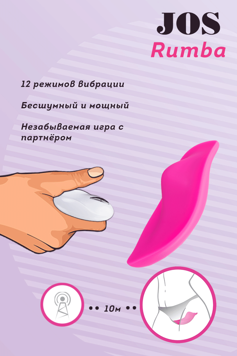 RUMBA Клиторальный вибратор в трусики Тысячи сценариев флирта с наслаждением вы сможете разыграть с RUMBA. Просто поместите игрушку в трусики и отдайте пульт своему партнеру. Дома, в гостях, в ресторане или в клубе - вы сможете получить тайное наслаждение от взаимодействия друг с другом. Горошинка на кончике будет интенсивно стимулировать клитор. Изготовлен из высококачественного бархатистого силикона. Заряжается от USB. -12 режимов вибрации Бархатистый силикон Пульт дистанционного управления