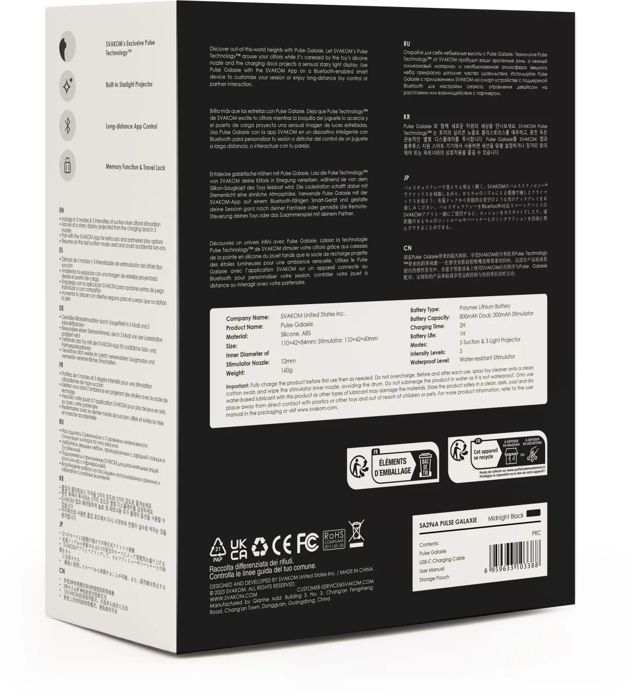 В Pulse Galaxie используется запатентованная технология Pulse Technology™ компании SVAKOM, которая толкает и втягивает воздух, создавая плотный эффект всасывания, напоминающий оральный секс, и возбуждает клитор, от видимой части до его более глубоких структур внутри тела. С силиконовой насадкой премиум-класса, расположенной на клиторе, исследуйте 5 режимов и 5 уровней интенсивности всасывания для самых интенсивных оргазмов.