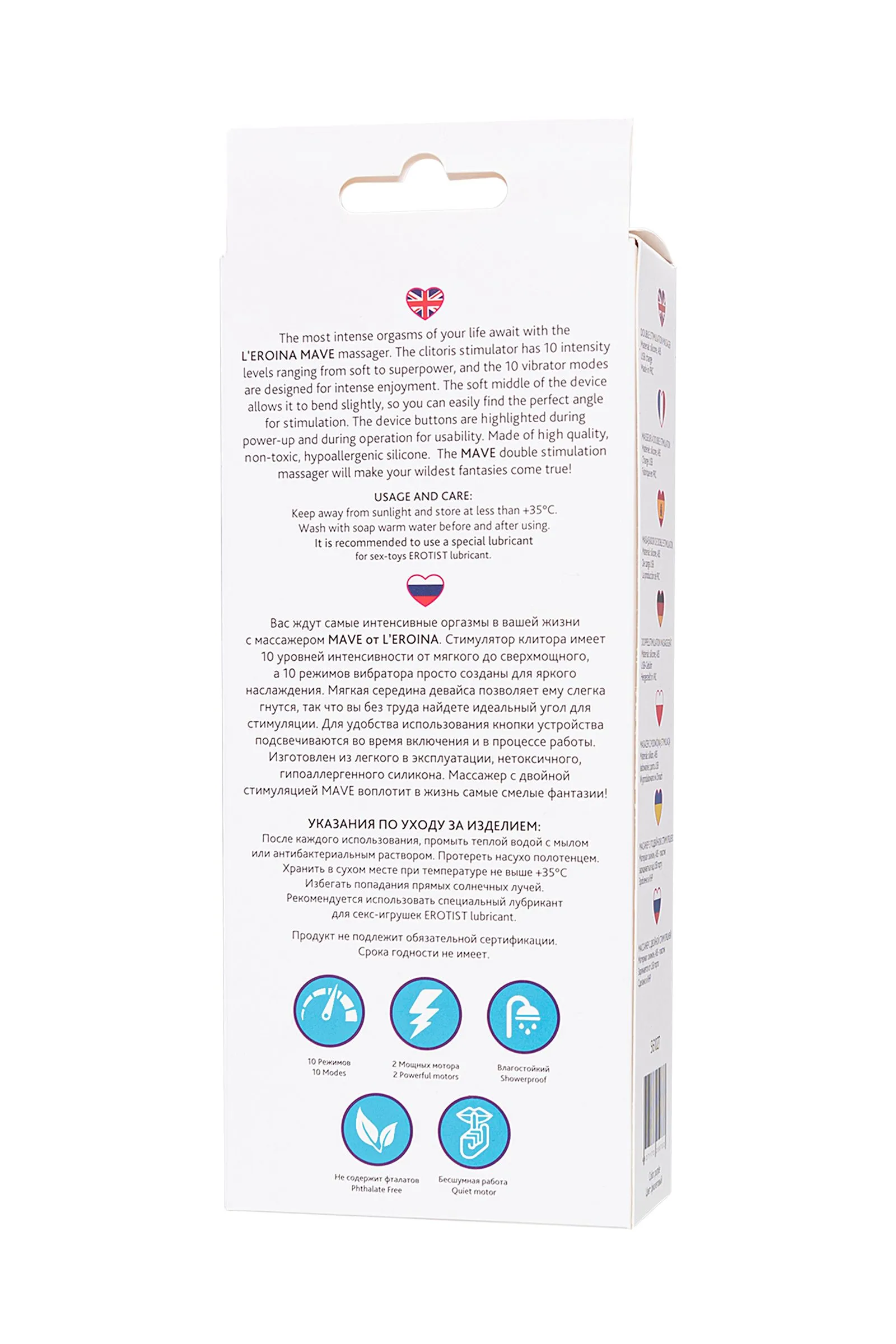 Вас ждут самые интенсивные оргазмы в вашей жизни с массажером MAVE от L’EROINA. Стимулятор клитора имеет 10 уровней интенсивности от мягкого до сверхмощного, а 10 режимов вибратора просто созданы для яркого наслаждения. Мягкая середина девайса позволяет ему слегка гнутся, так что вы без труда найдете идеальный угол для стимуляции. Для удобства использования кнопки устройства подсвечиваются во время включения и в процессе работы. Изготовлен из легкого в эксплуатации, нетоксичного, гипоаллергенного силикона. Массажер с двойной стимуляцией MAVE воплотит в жизнь самые смелые фантазии! Общая длина: 14 см Рабочая длина: 12 см 10 режимов вибрации 10 режимов клиторальной вакуумной стимуляции Бесшумная работа Влагостойкий 2 Мощных мотора Диаметр 2,3-3,6
