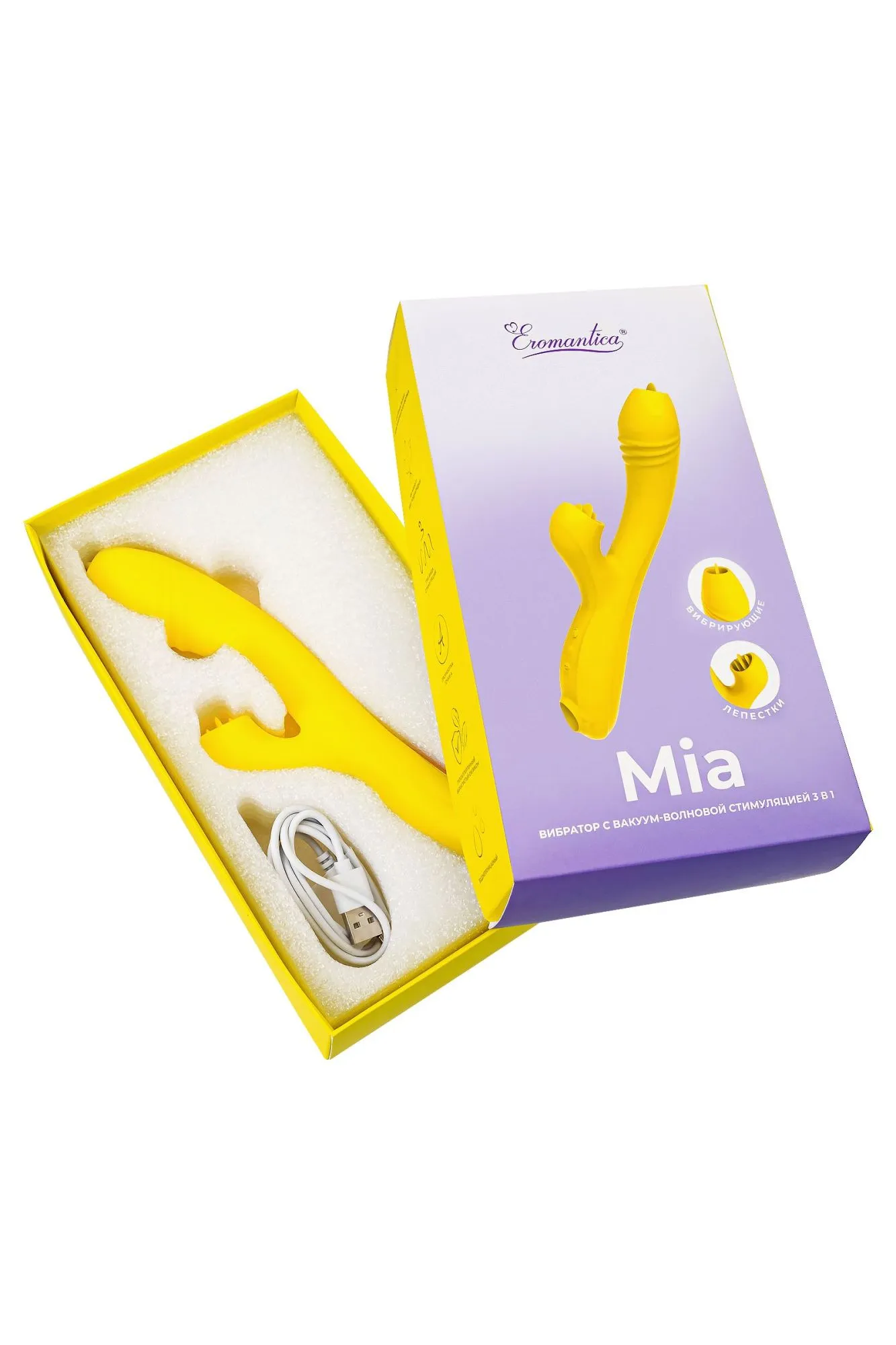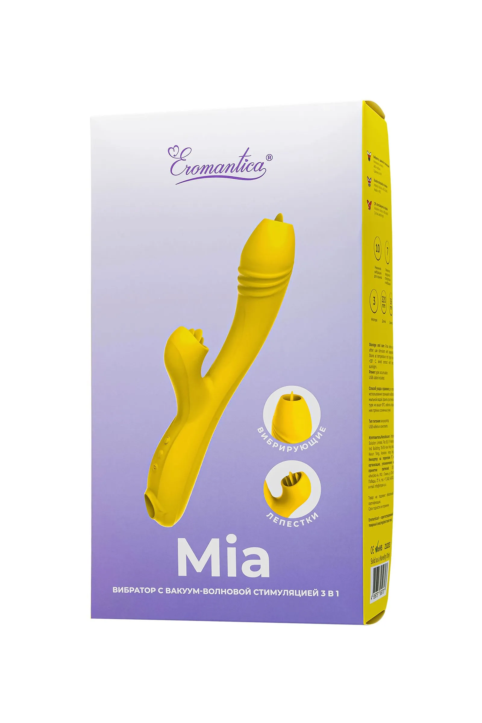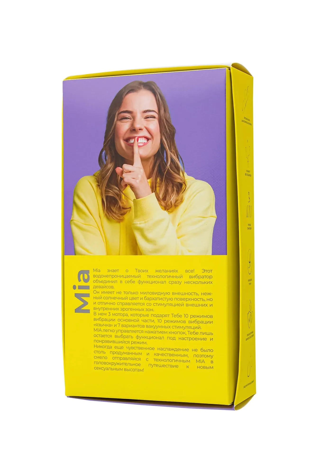 MIA знает о Твоих желаниях все! Этот водонепроницаемый технологичный вибратор объединил в себе функционал сразу нескольких девайсов. Он имеет не только миловидную внешность, нежный солнечный цвет и бархатистую поверхность, но и отлично справляется со стимуляцией внешних и внутренних эрогенных зон. В нем 3 мотора, которые подарят Тебе 10 режимов вибрации основной части, 10 режимов вибрации «язычка» и 7 вариантов вакуумных стимуляций. MIA легко управляется нажатием кнопок, Тебе лишь остается выбрать функционал под настроение и понравившийся режим. Никогда еще чувственное наслаждение не было столь продуманным и качественным, поэтому смело отправляйся с технологичным MIA в головокружительное путешествие к новым сексуальным высотам!