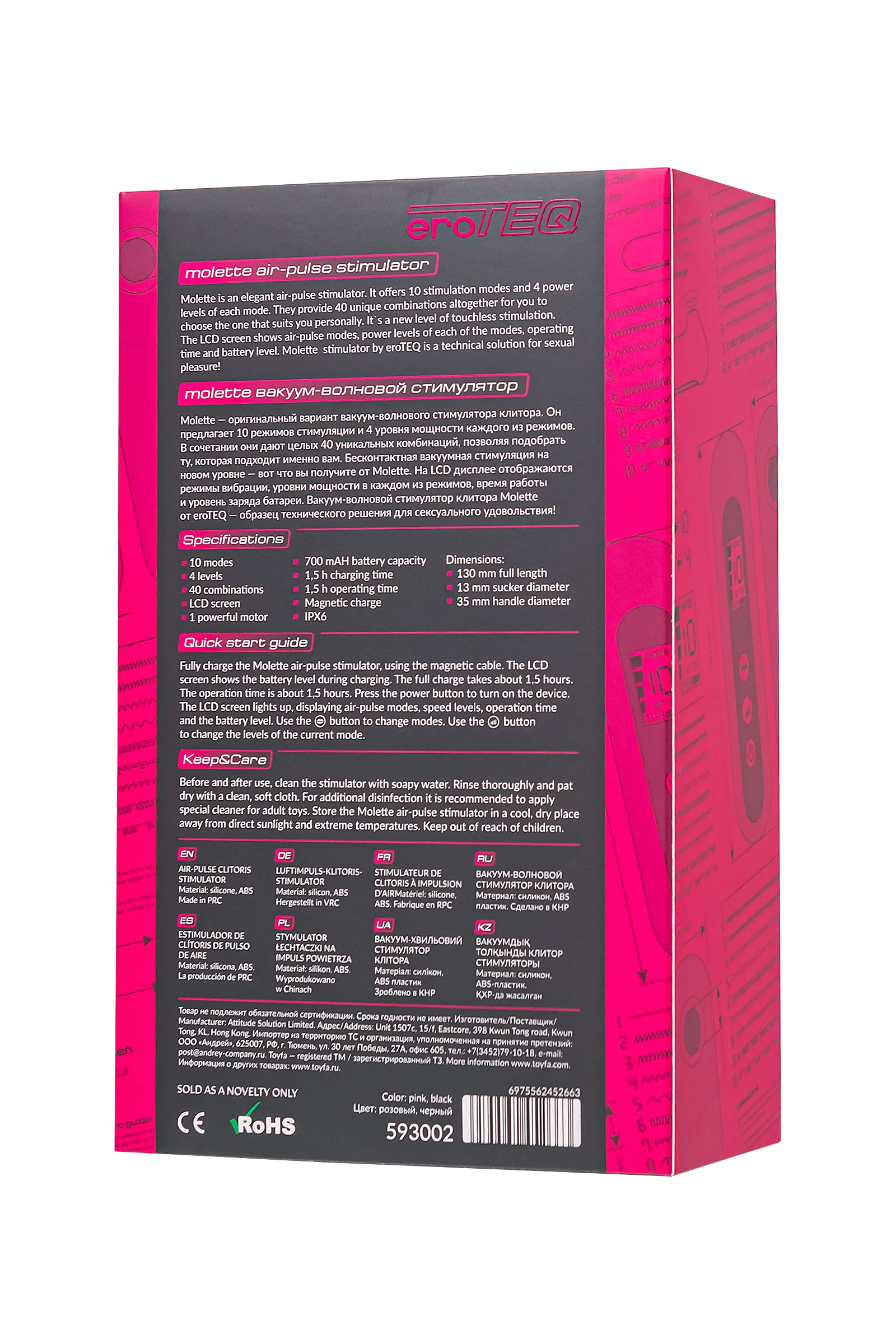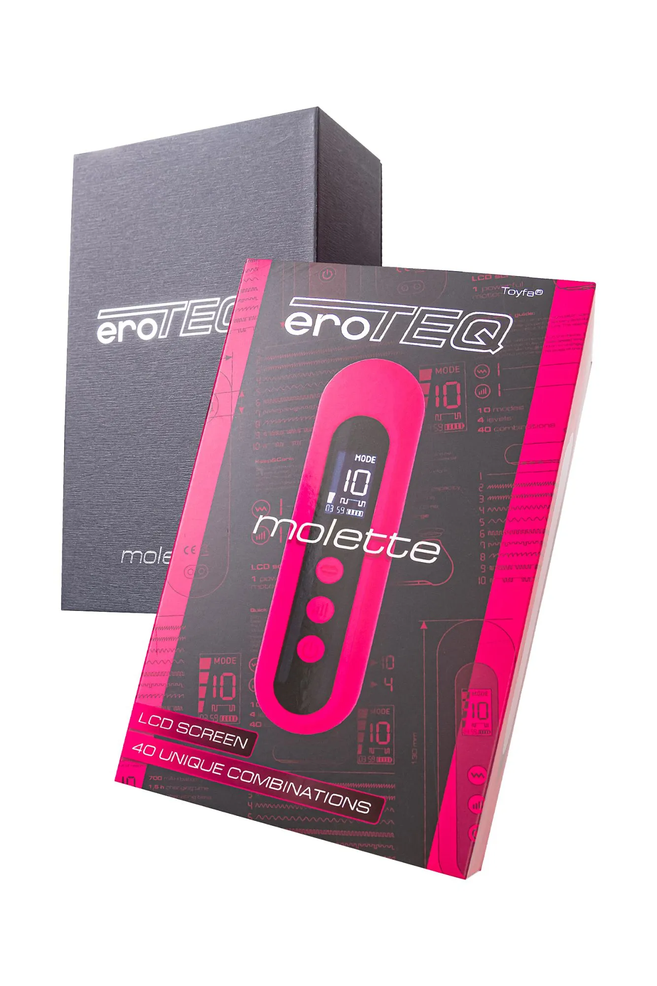 Встречайте оригинальный вакуум-волновой стимулятор клитора Molette от eroTEQ. С 10 режимами стимуляции и 4 уровнями мощности каждого режима, Molette предлагает целых 40 уникальных комбинаций, призванных подарить вам неповторимое наслаждение. Меняйте варианты и интенсивность воздействия на клитор и прокачивайте собственную чувствительность, открывая новые возможности вашего тела. Этот вакуумный аппарат продвигает бесконтактную стимуляцию на новый уровень. LCD дисплей предоставляет вам полный контроль над процессом – режимы вибрации, уровни мощности, время работы и заряд батареи. Molette удобно лежит в ладони, полная длина – 130 мм, диаметр раструба составляет 1,3 см, что подходит большинству женщин. Возможности Molette позволяют вам наслаждаться моментами интимного блаженства с полной уверенностью и комфортом. Три кнопки на корпусе с понятными обозначениями обеспечивают простое и комфортное управление вашим удовольствием. Революционная концепция Molette начинается с LCD экрана, который предоставляет полный контроль над всеми функциями – режимами вибрации, временем работы и уровнем заряда батареи. Гладкая, бесшовная поверхность из высококачественного силикона не только дарит нежность, но и гарантирует абсолютную безопасность при каждом прикосновении. Сочетание соблазнительного розового оттенка и изысканного дизайна приносит удовлетворение и радость! Впечатляйтесь функционалом игрушки даже в душе, благодаря водонепроницаемой технологии IPX6, обеспечивающей простоту в уходе. Рекомендуется использовать лубрикант на водной основе. Вакуум-волновой стимулятор клитора Molette от eroTEQ – образец технического решения для сексуального удовольствия! Технические характеристики: 10 режимов для настраиваемого удовольствия 4 уровня мощности для индивидуальных предпочтений LCD-экран для интуитивного контроля 1 мощный мотор для максимальной эффективности Время зарядки 1,5 часа для быстрого подзарядки Время работы 1,5 часа для долгих сессий удовольствия Магнитный заряд для удобства использования Водонепроницаемость IPX6 для разнообразия вариантов использования