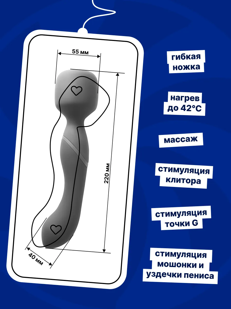 Двусторонний вонд изготовлен из гипоаллергенного силикона и полностью водонепроницаем. Два мощных перезаряжаемых мотора имеют по 10 режимов глубокой вибрации, а подвижная головка способна нагреваться до 42 градусов за 5 минут. Игрушка оснащена индикатором уровня заряда батареи - кнопки подсвечиваются, когда заряд достигает отметки в 15%. Подходит для массажа, а также эффективно простимулирует клитор и любые внешние эрогенные зоны. Проникающая часть идеальна для вагинальной и анальной стимуляции. Для включения удерживайте кнопку карамельки на передней панели игрушки 3 секунды. Когда игрушка включена, кнопки светятся. Стрелка наверх отвечает за мотор головки, стрелка вниз - за мотор проникающей части. Легкое нажатие стрелок переключает режимы вибрации. Кнопка нагрева в виде огонька расположена на задней стороне игрушки. Удержание в течении 3 секунд данной кнопки включает режим нагрева. Время зарядки: 180 мин. Время работы: 1 мотор - 95 мин, 1 мотор + нагрев, 2 мотора - 75 мин, 2 мотора + нагрев - 50 мин.