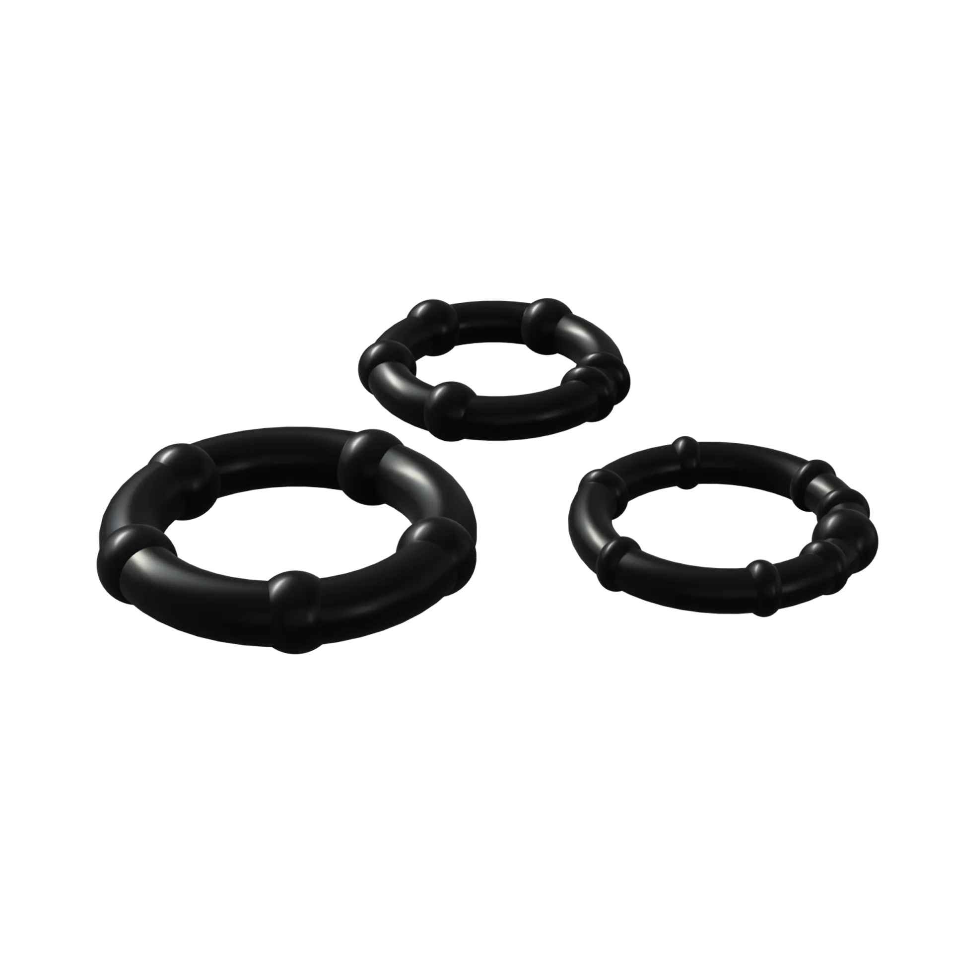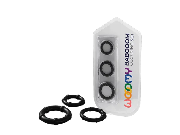 Babooom — набор из трех эластичных колец для пениса с диаметрами 2,5 см, 2,2 см и 2 см, разработанный для усиления эрекции и задержки оргазма. Кольца можно использовать по отдельности или вместе, регулируя интенсивность эффекта. Изготовлены из мягкого и безопасного TPE, они комфортны и не содержат фталатов. Вес набора — всего 23 г, что делает его легким и удобным. Водонепроницаемость IPX8 позволяет применять их в любых условиях. Текстура с небольшими шариками добавляет дополнительную стимуляцию для партнера. Цвет — черный.