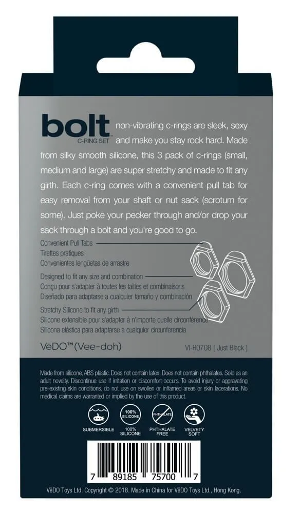 Набор колец VeDO Bolt от немецкой компании Orion состоит из трех эрекционных колец разного диаметра с угловатым дизайном. Несколько размеров позволят подобрать нужное кольцо для наибольшего удобства и удовольствия. Их можно использовать и в нескольких вариантах комбинаций, например носить их одновременно на члене и на мошонке для усиления ощущений.