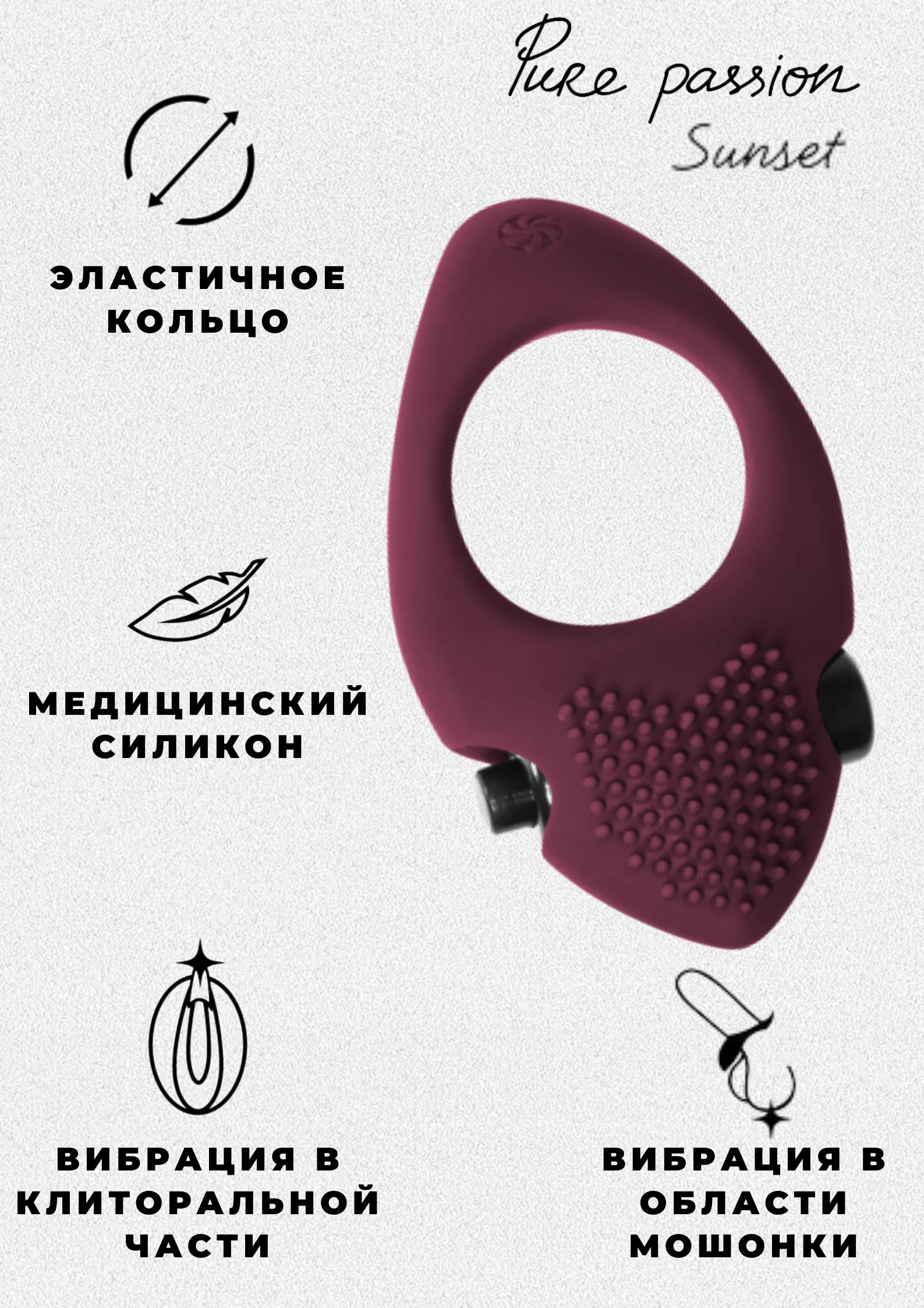 Эрекционное кольцо из эластичного силикона подходит для дополнительной стимуляции обоих партнёров. Имеет яркий рельеф и вибропулю в верхней части для клиторальной стимуляции. Также, кольцо можно перевернуть для дополнительной стимуляции мошонки. Кольцо хорошо тянется и подходит для всех размеров. Вибропулю можно с легкостью извлечь из силиконового кольца и использовать отдельно.