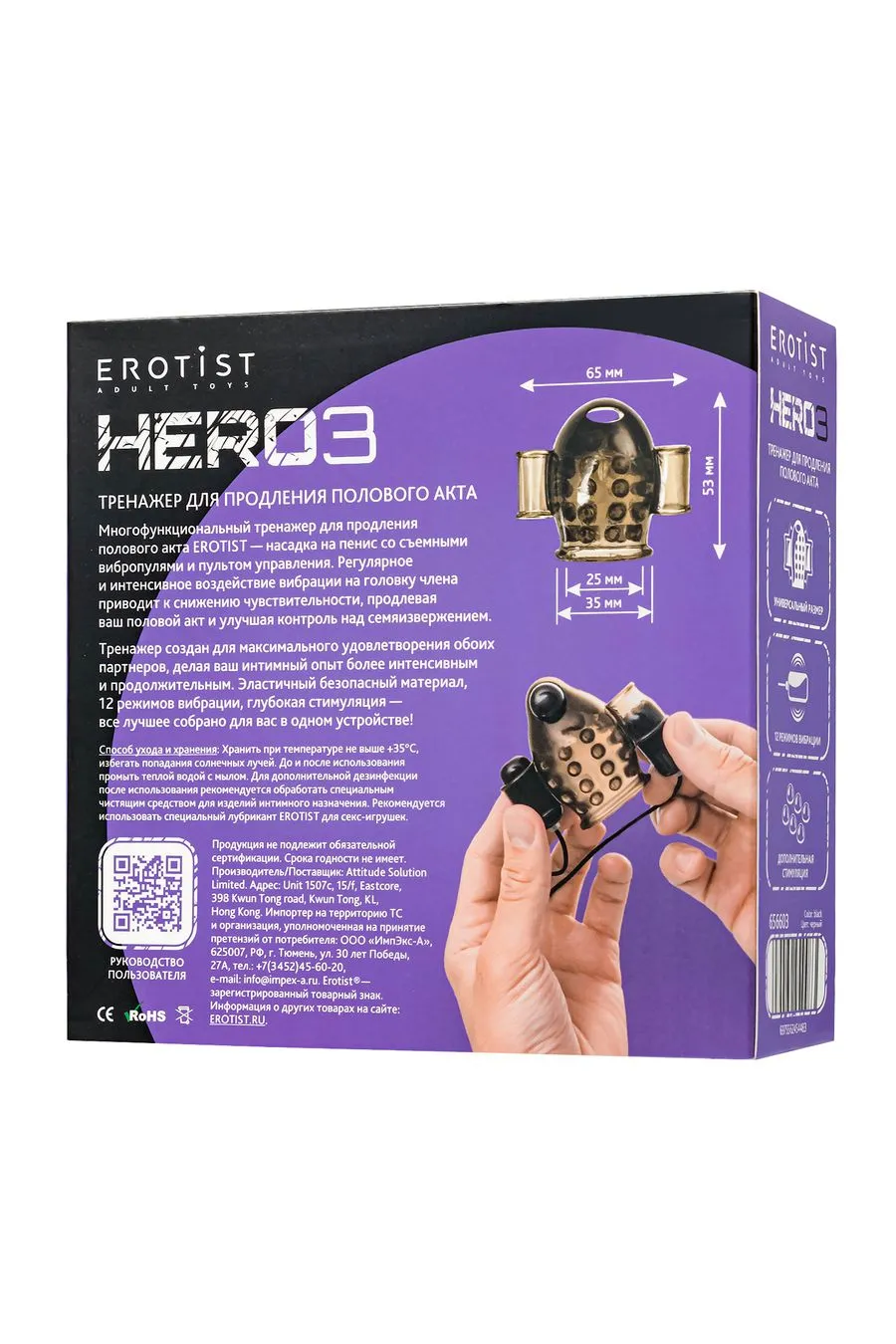 Многофункциональный тренажер для продления полового акта EROTIST HERO 3 – насадка на пенис со съемными вибропулями и пультом управления. Регулярное и интенсивное воздействие вибрации приводит к временному снижению чувствительности, продлевая ваш половой акт и улучшая контроль над семяизвержением. Тренажер создан для максимального удовлетворения обоих партнеров, делая ваш интимный опыт более интенсивным и продолжительным. Эластичный безопасный материал, 12 режимов вибрации, глубокая стимуляция – все лучшее собрано для вас в одном устройстве!