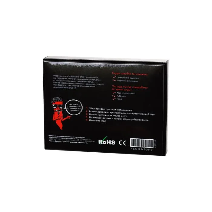Игра-бомба, игра-хит, игра, которую разбирают быстрее, чем горячие пирожки. Романтично-эротическая игра состоит из 30 карточек-сценариев, плюс наручники в каждой коробке. Девушкам нравится, парни в восторге. Не важно, чего тебе хочется больше - доминировать или подчиняться - получай максимальное удовольствие от процесса и наслаждайся своей новой ролью. Главное, во всех случаях применения наручников соблюдай меры безопасности и не допускай возникновения дискомфортных ощущений.