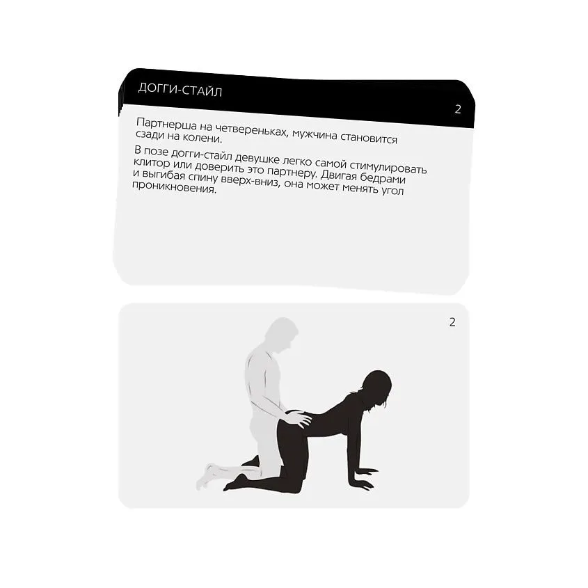 Этот набор позволит вам разнообразить сексуальную жизнь и добавить в неё немного перчинки. Вас ждут 5 карт с позами для секса: на одной стороне описание позы, а на другой — иллюстрация. Выбирайте позы, которые хотите попробовать сегодня, и наслаждайтесь друг другом. Также в комплект входят 2 анальные втулки разного размера для активации чувствительных окончаний и получения новых ощущений.