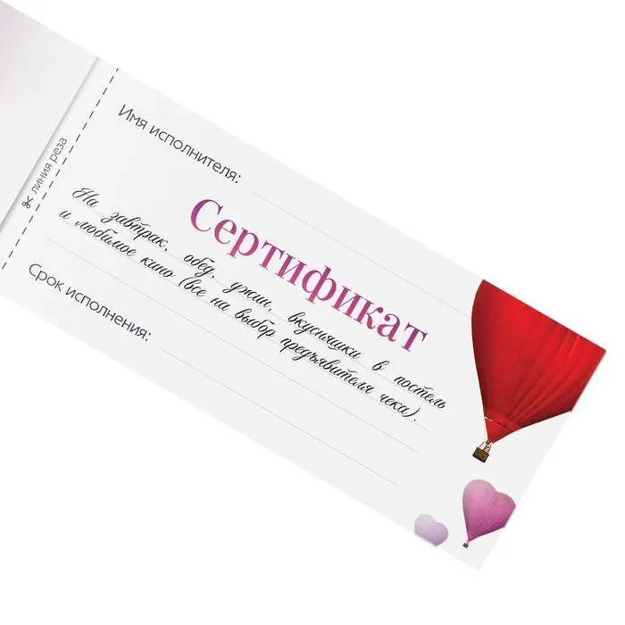 Перед вами чековая книжка, которая привнесёт в отношения яркие впечатления, подарит новые эмоции и позволит ещё больше сблизиться со второй половинкой. Выписывайте чеки и наблюдайте за тем, как волшебство происходит на ваших глазах! Как использовать купоны? Изучите книжку и выберите задания, которые понравились вам больше всего. На каждом купоне необходимо указать имя исполнителя и срок выполнения задания. Осталось только вручить чек и ждать. Дарите друг другу любовь и наслаждение!