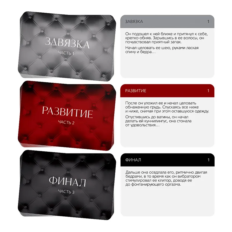 Как пользоваться набором? В игре вас ждут 3 сценария на выбор – «Знакомство в сети», «Любовь за деньги» или «Служебный роман». Это предыстории персонажей, в которых вам предстоит перевоплотиться. Они помогут создать атмосферу и подготовить антураж, необходимые для ролевой игры. Мужчина берёт лист «Сценарии для него», а девушка – «Сценарии для неё». Во время игрового процесса вашими действиями будут управлять карты «Завязка», «Развитие» и «Финал». Вытяните по одной карте из каждой колоды и положите их лицом вверх по порядку. Читайте получившийся сценарий, состоящий из предысторий и выложенных карт «Завязка», «Развитие» и «Финал» и воплощайте его в реальность.